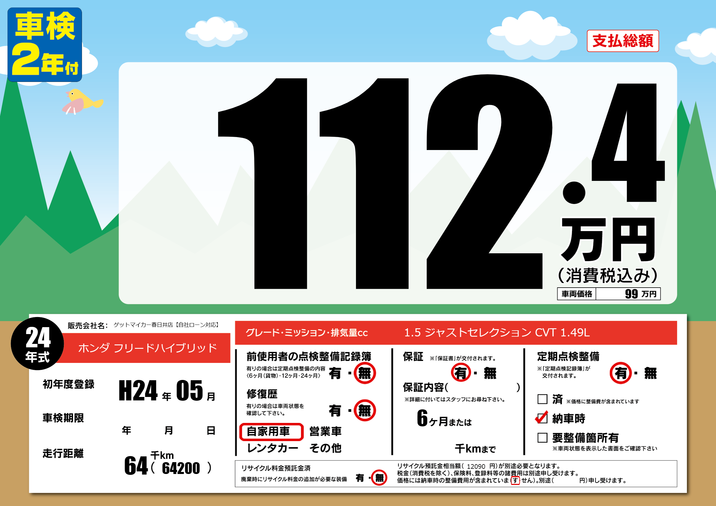 | 車名 | ホンダ フリードハイブリッド | グレード ミッション 排気量 |
