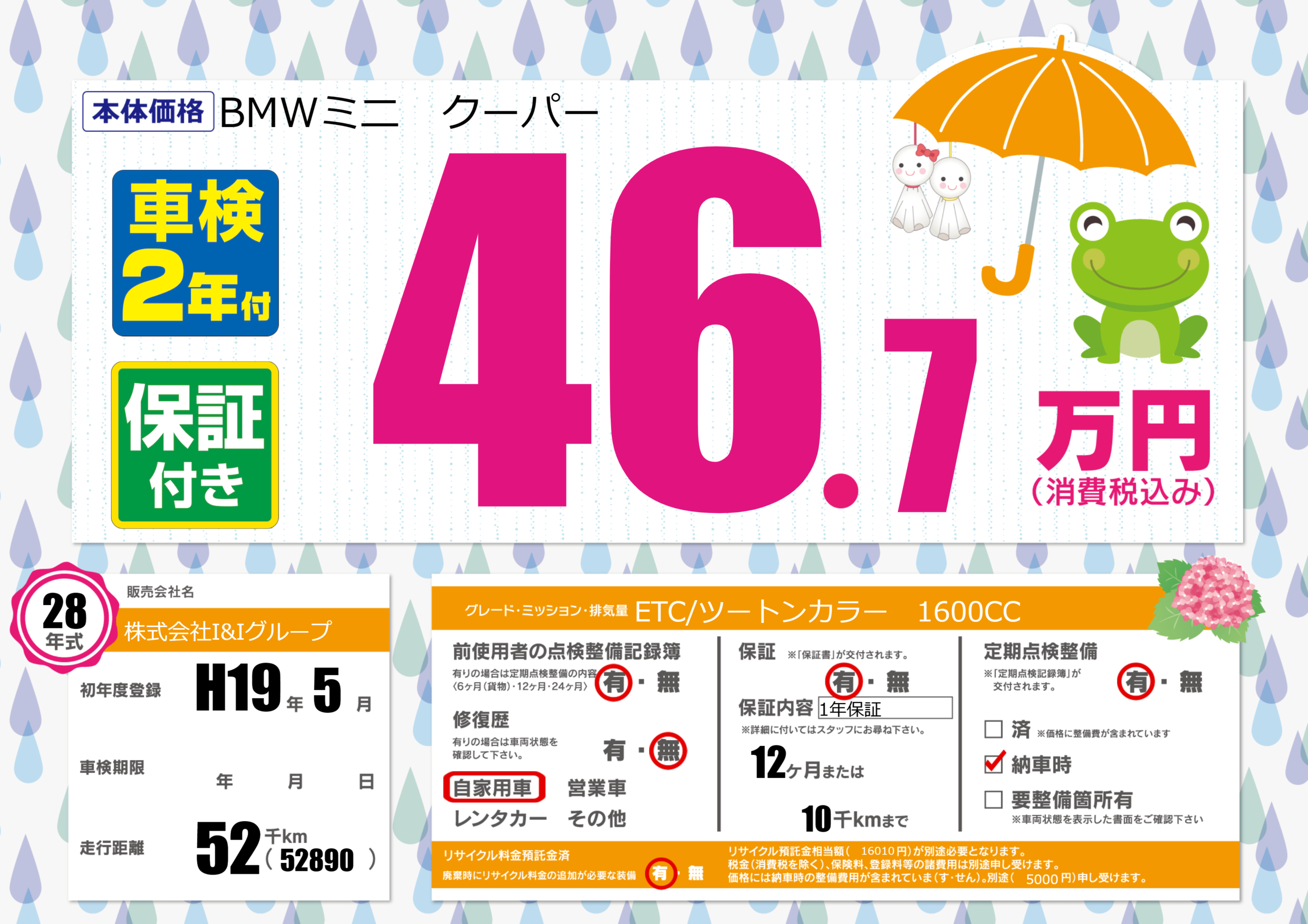 | 車名 | BMWミニ クーパー | グレード ミッション 排気量 |