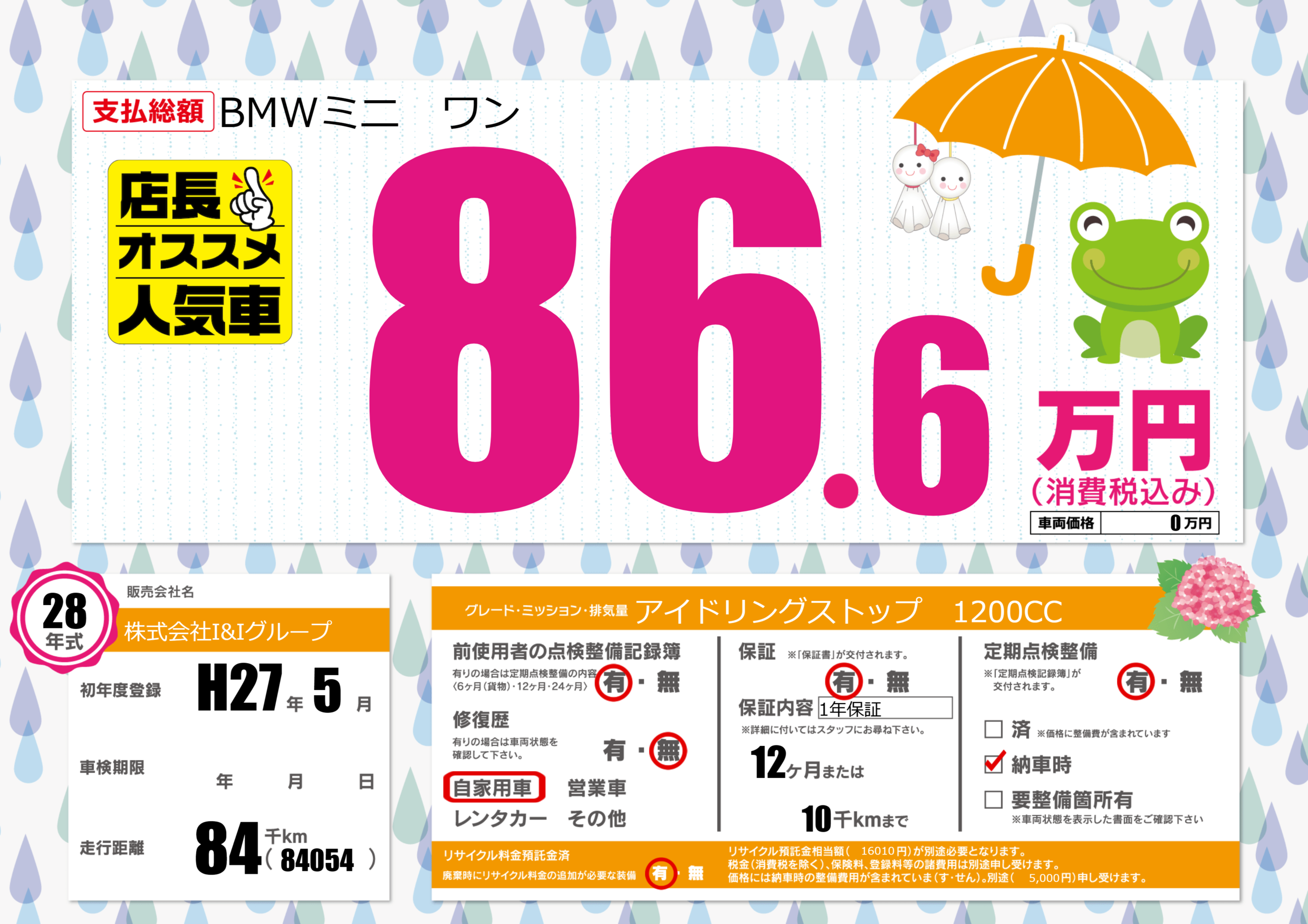 | 車名 | BMWミニ ワン | グレード ミッション 排気量 |