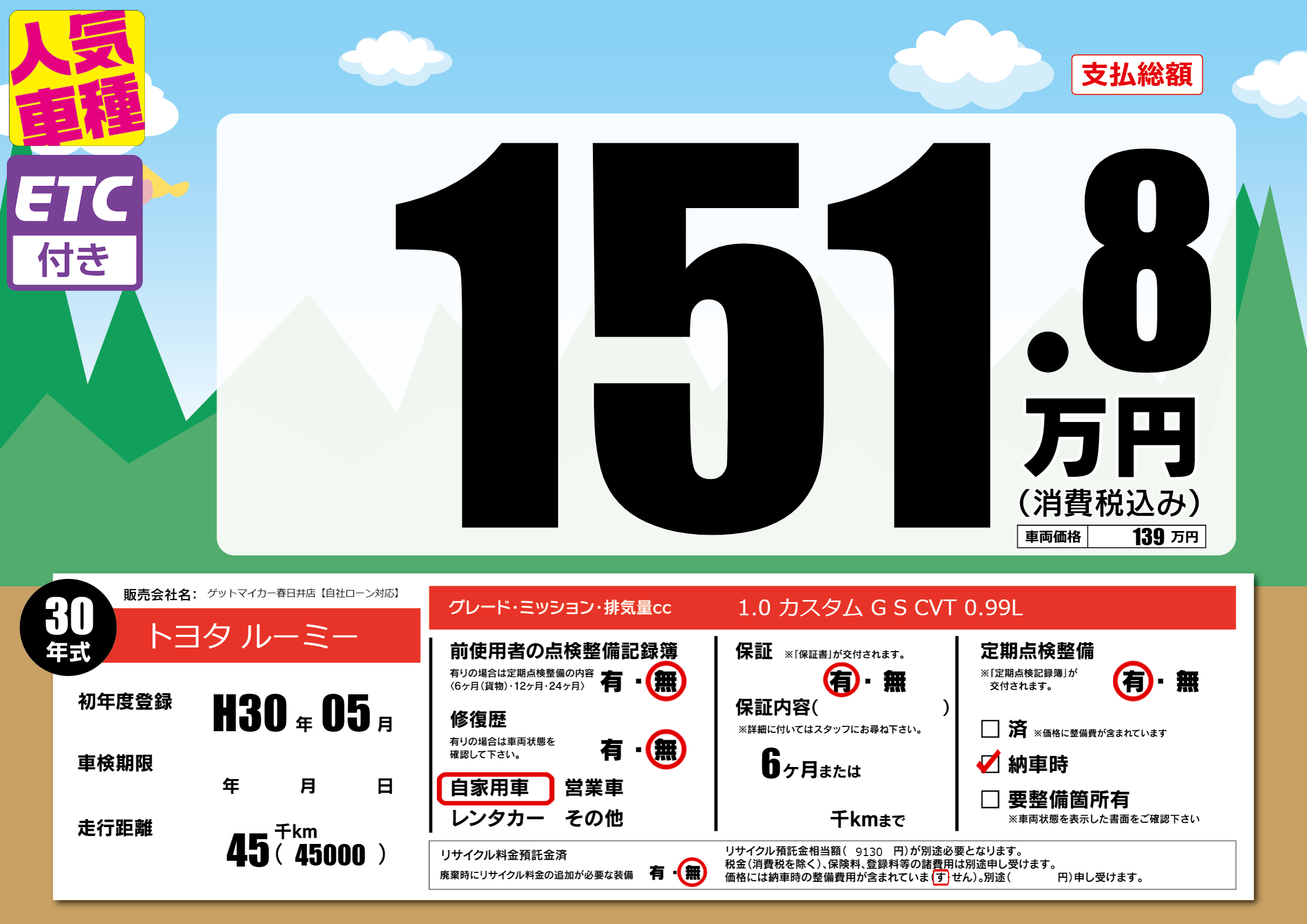 | 走行キロ | 4.5万km | 初年度登録 | H30年05月 |