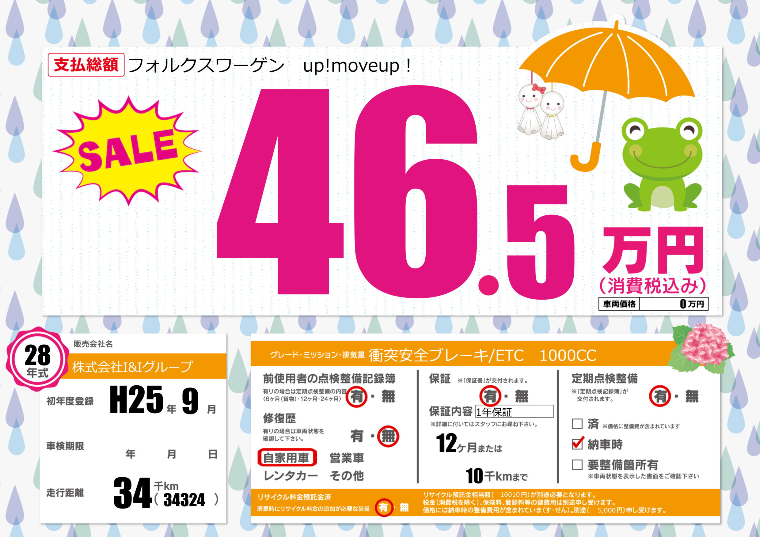 | 車名 | フォルクスワーゲン up!moveup! | グレード ミッション 排気量 |