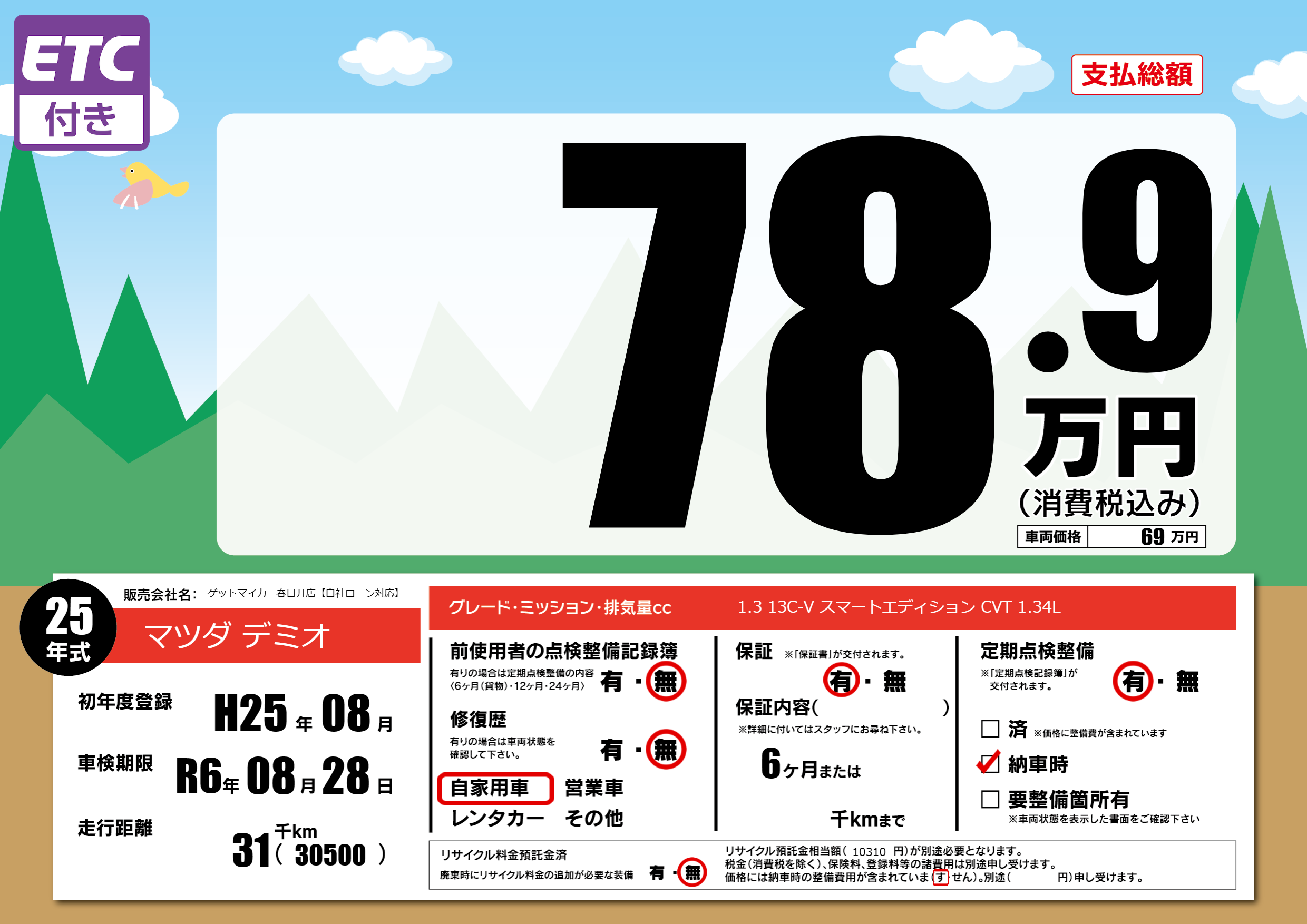 | 走行キロ | 3.1万km | 初年度登録 | H25年08月 |