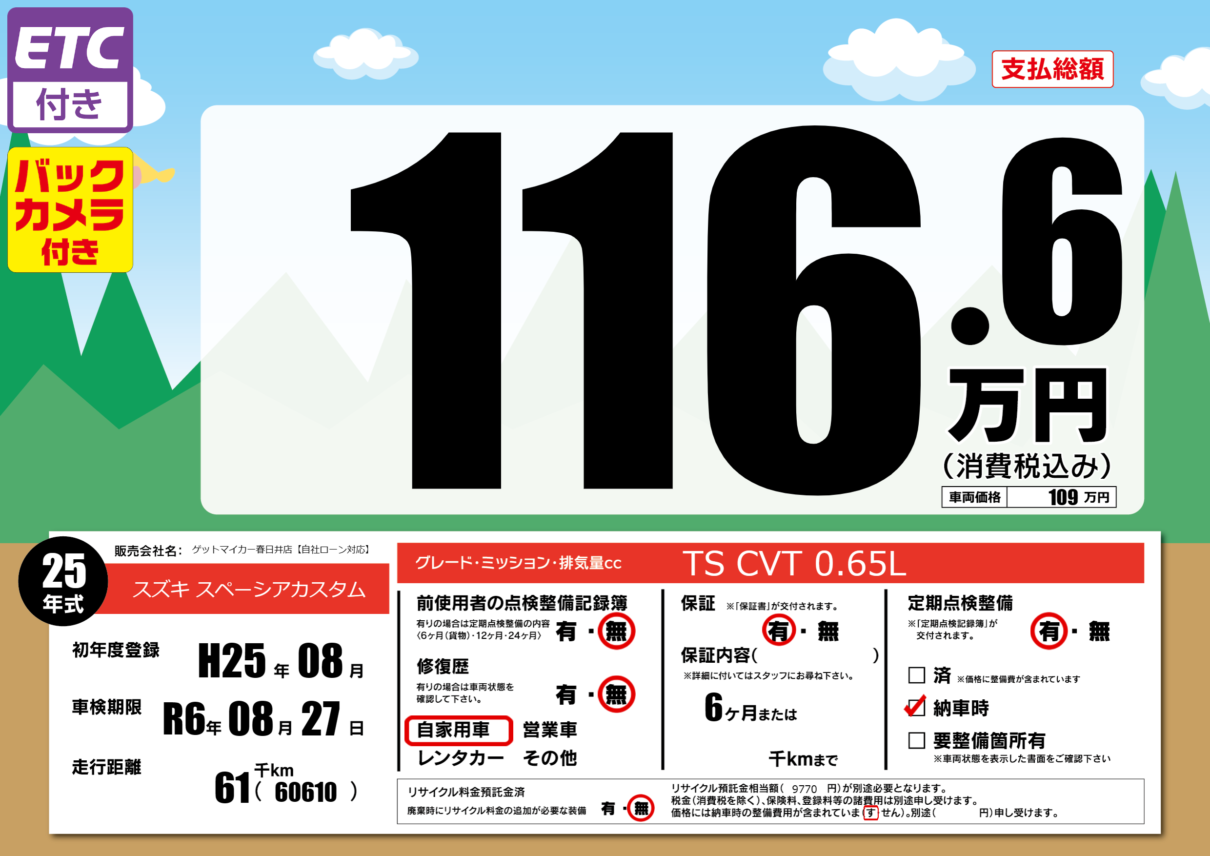 | 走行キロ | 6.1万km | 初年度登録 | H25年08月 |