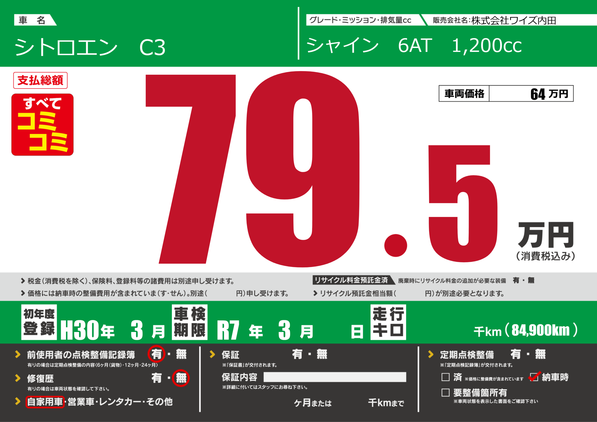 | 車名 | シトロエン C3 | グレード ミッション 排気量 |