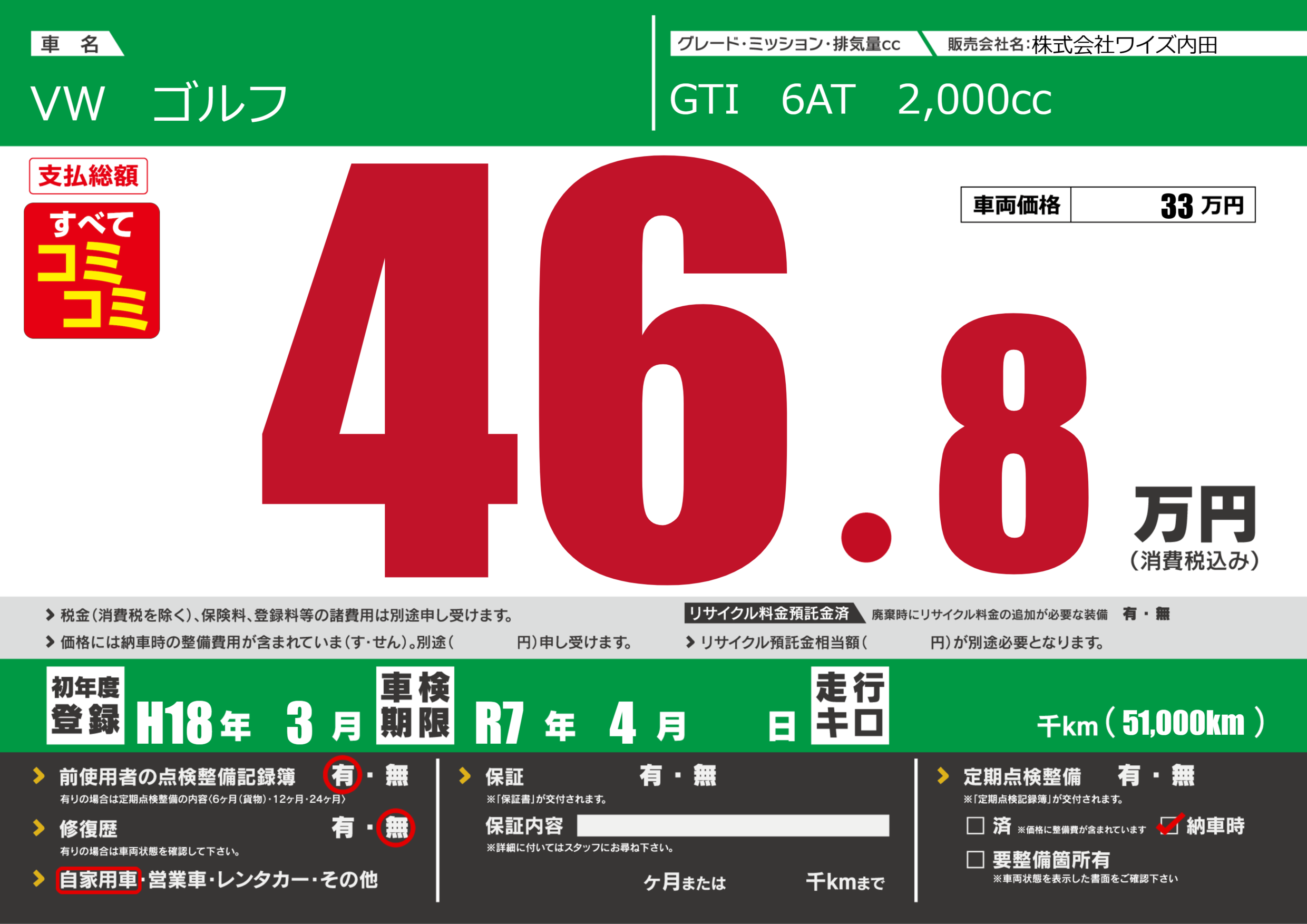 なし | 車検制限 | R7年4月---月 |
