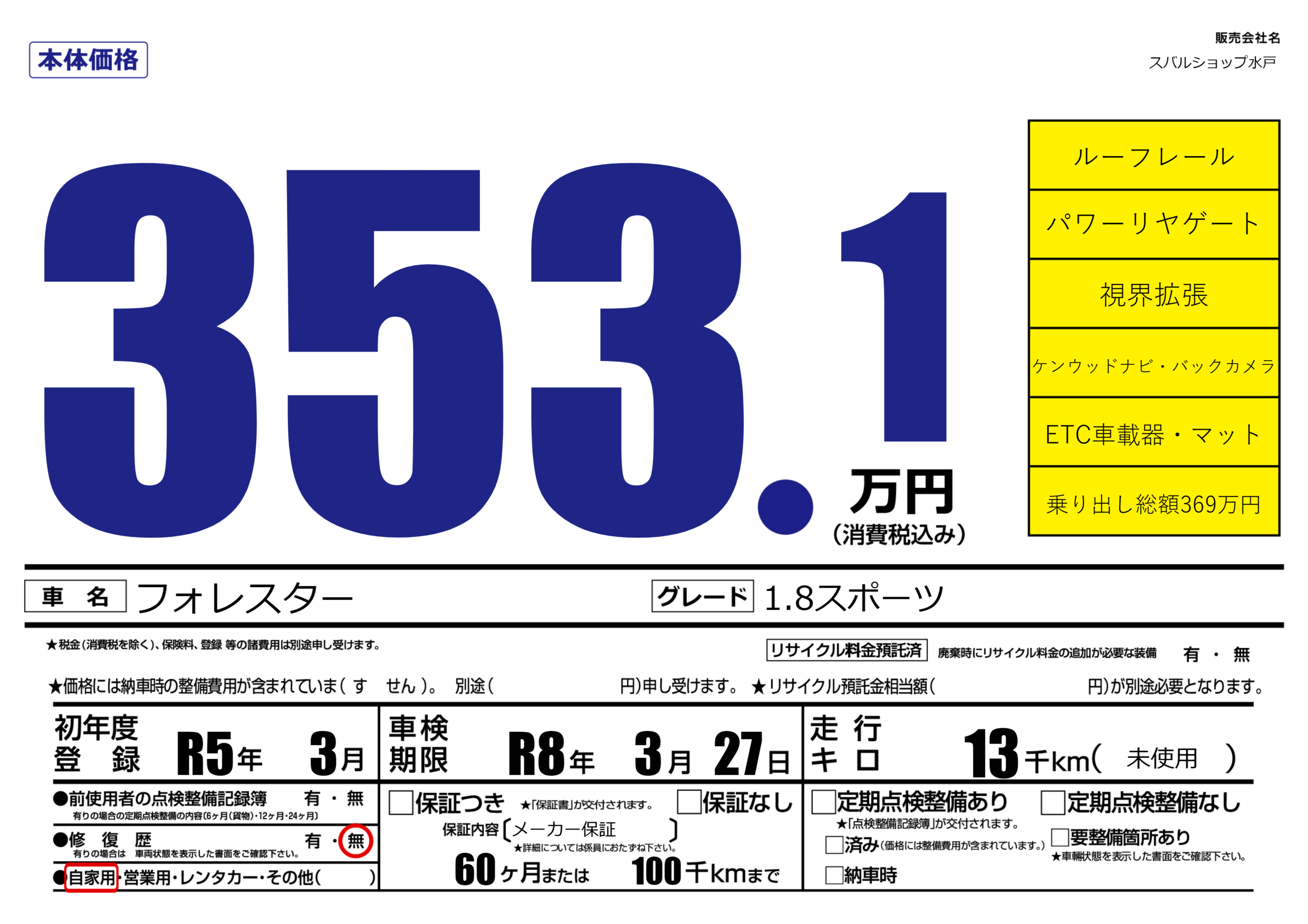 | 車名 | フォレスター | グレード ミッション 排気量 |