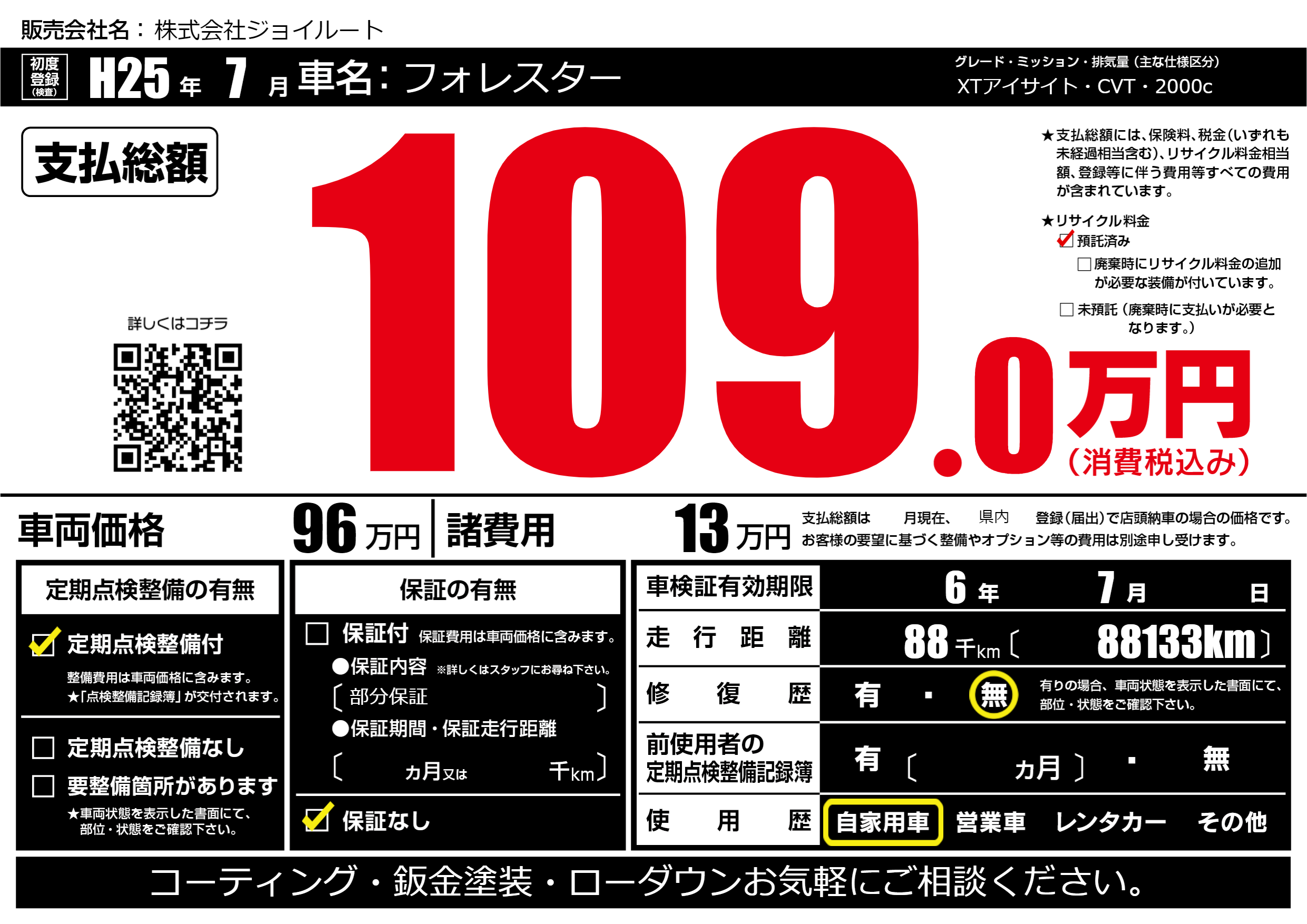 | 車名 | フォレスター | グレード ミッション 排気量 |