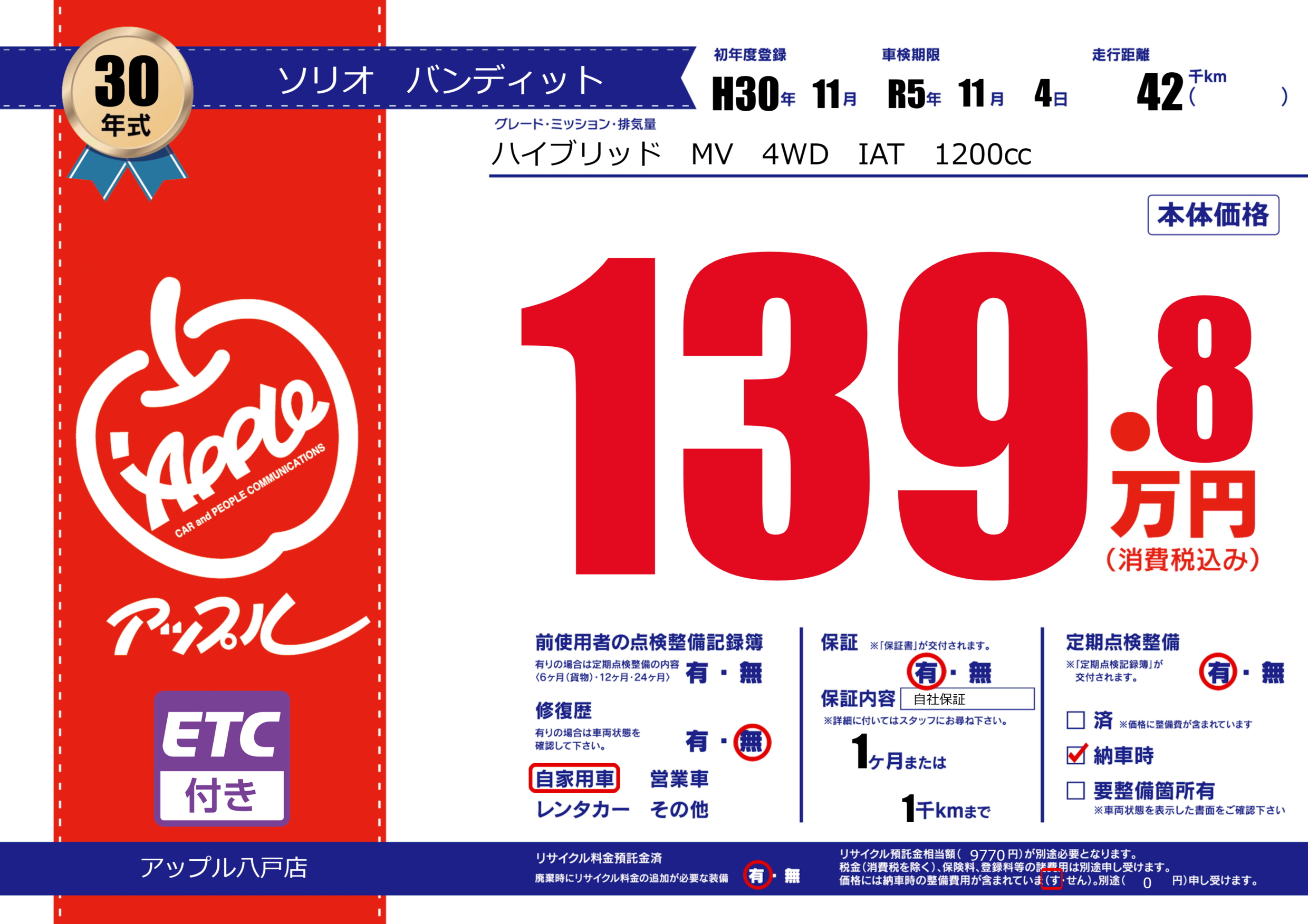 保証付き 保証内容( 自社保証) 1ヶ月または(1)千kmまで |
