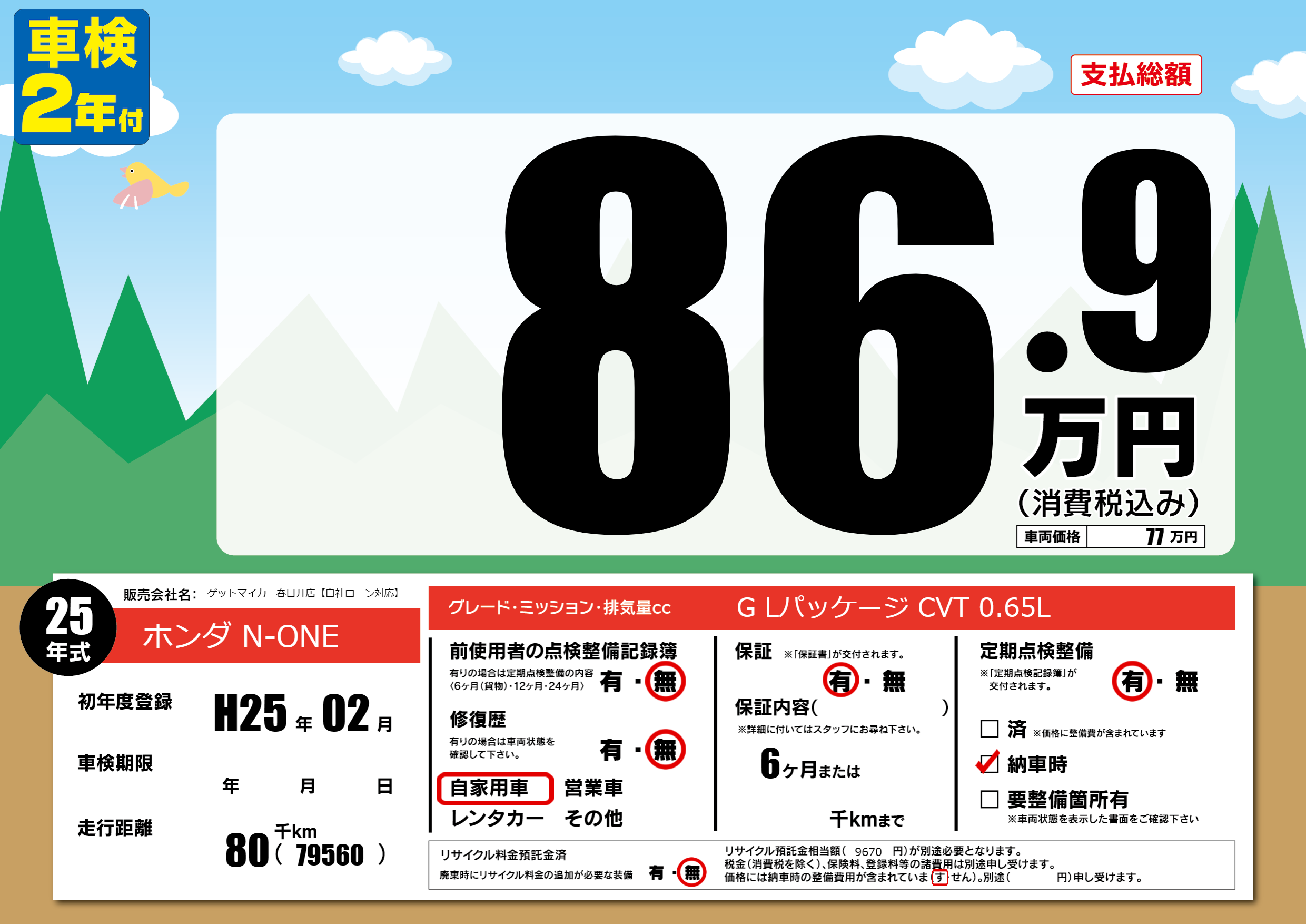 | 車名 | ホンダ N-ONE | グレード ミッション 排気量 |
