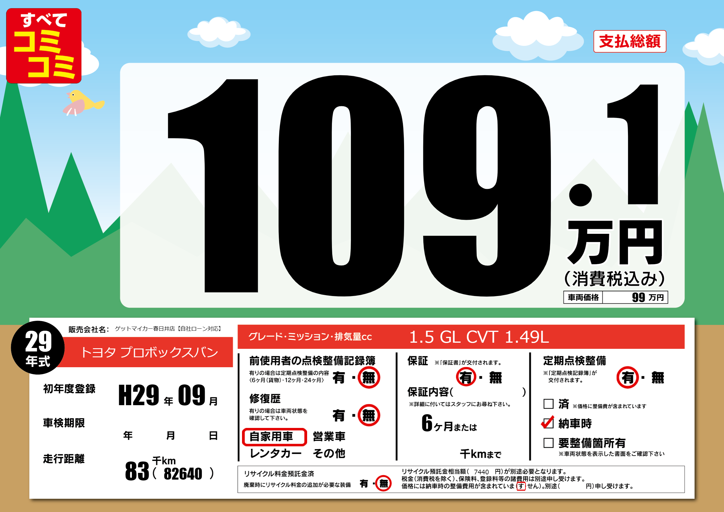 | 走行キロ | 8.3万km | 初年度登録 | H29年09月 |
