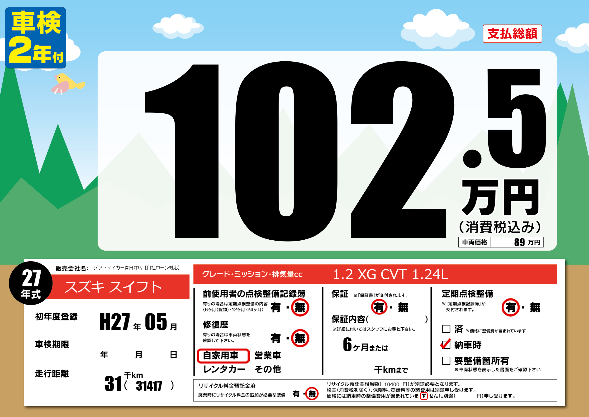 | 走行キロ | 3.1万km | 初年度登録 | H27年05月 |