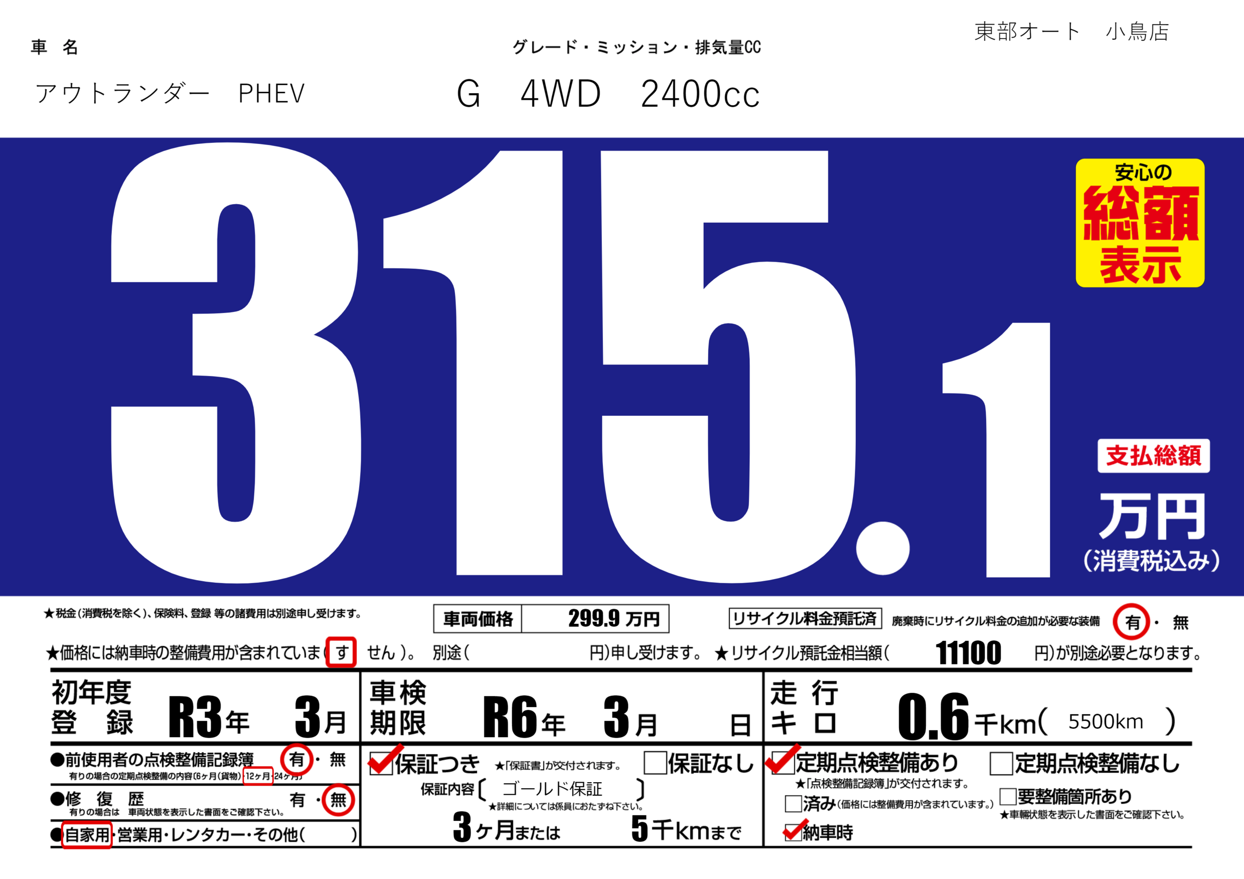 | 車名 | アウトランダー PHEV | グレード ミッション 排気量 |