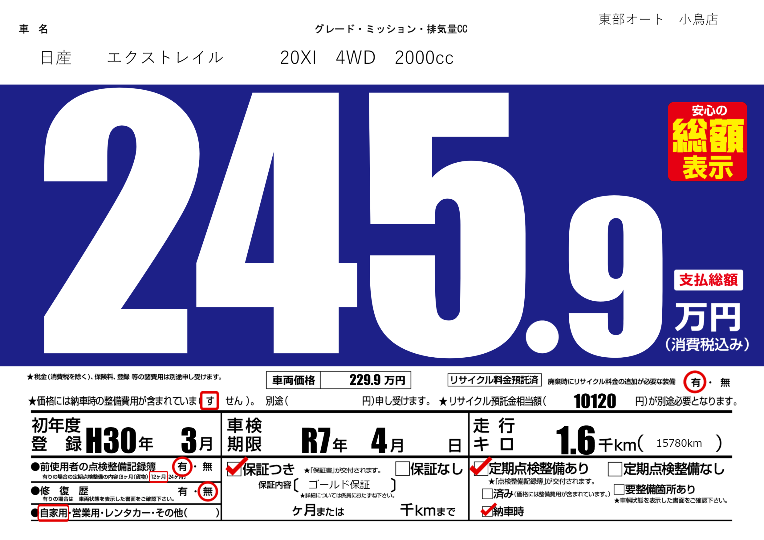 | 車検制限 | R7年 4月 - 日 | ||