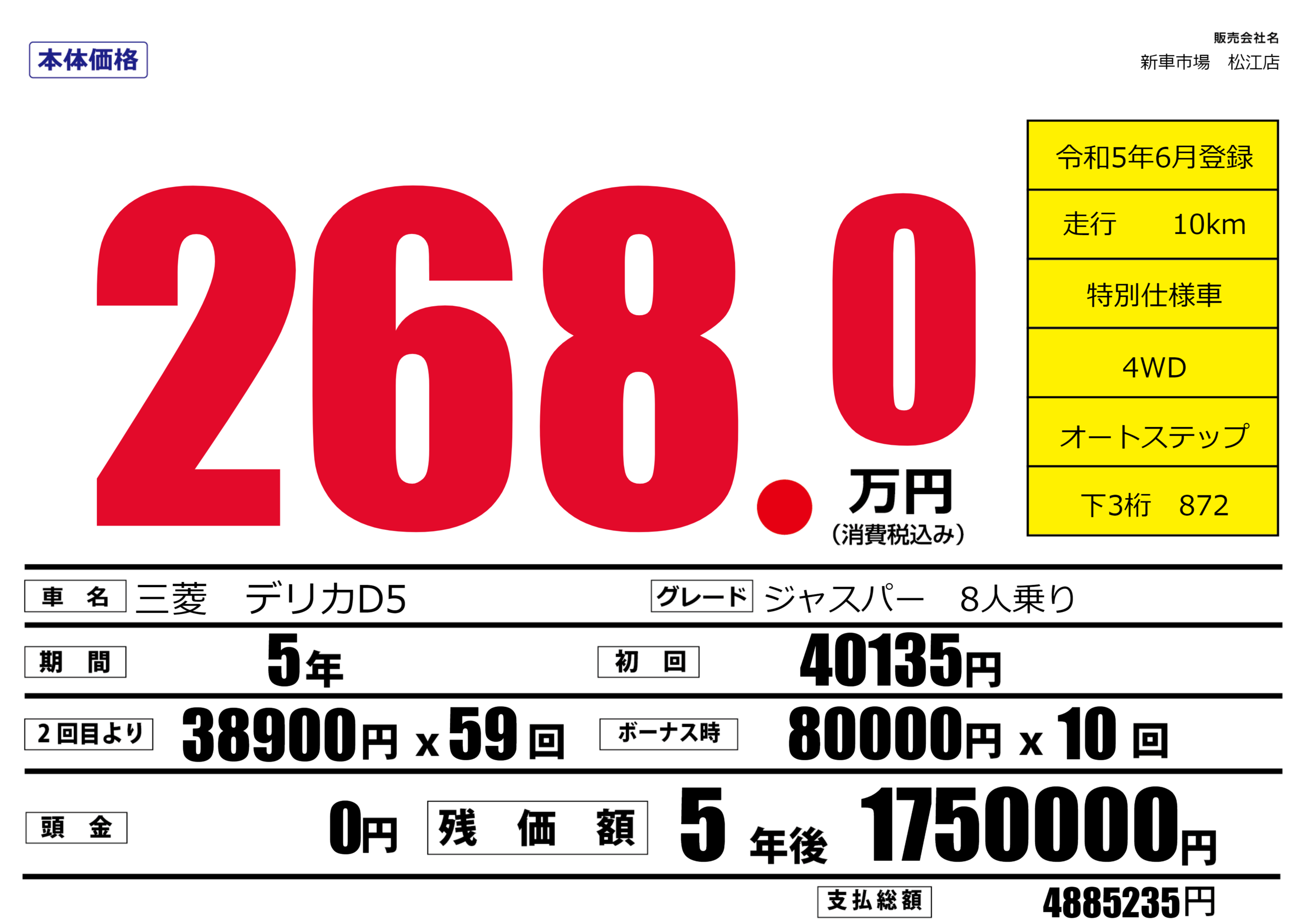 | 車名 | 三菱 デリカD5 | グレード ミッション 排気量 |