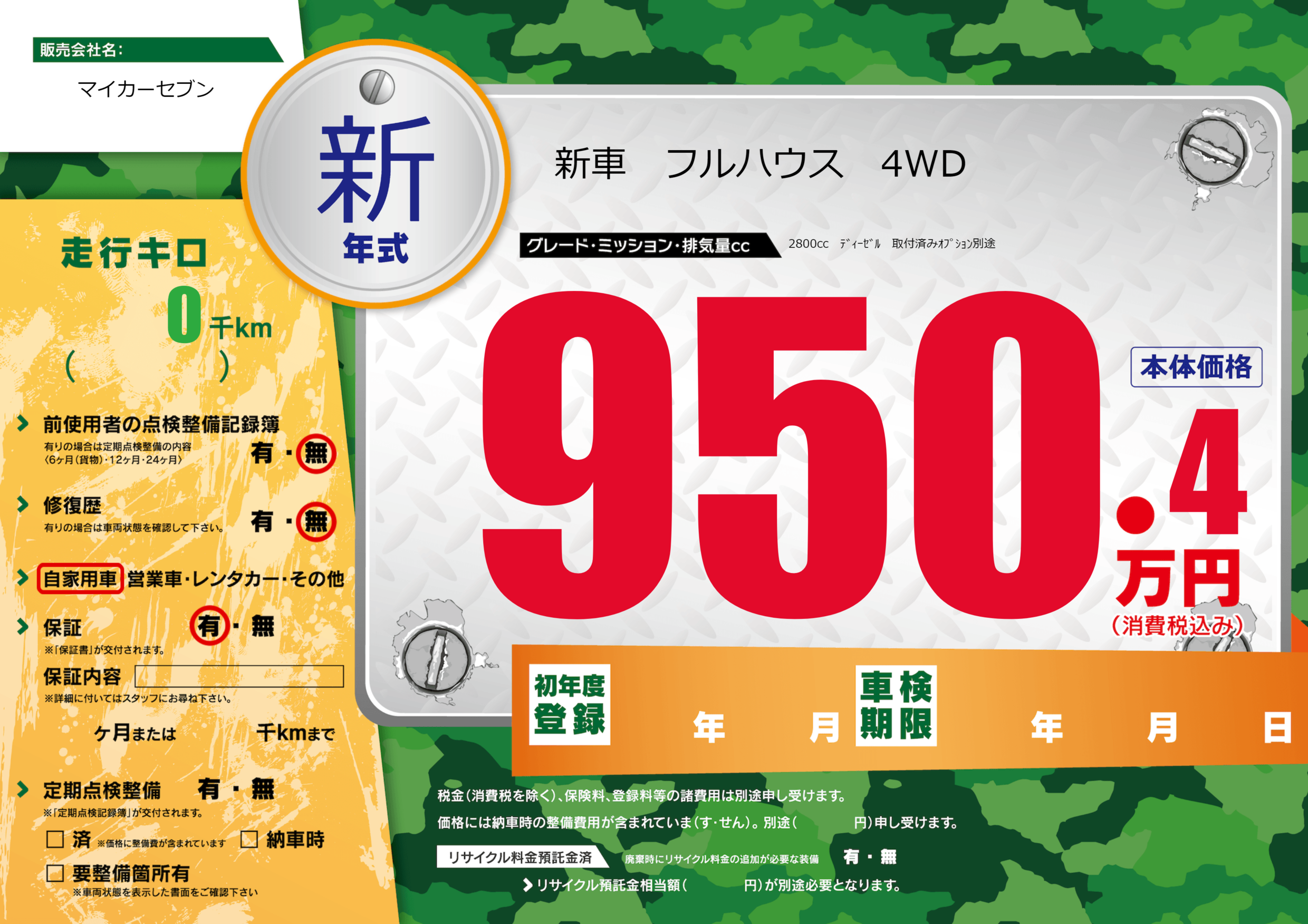 | 車名 | 新車 フルハウス 4WD | グレード ミッション 排気量 |
