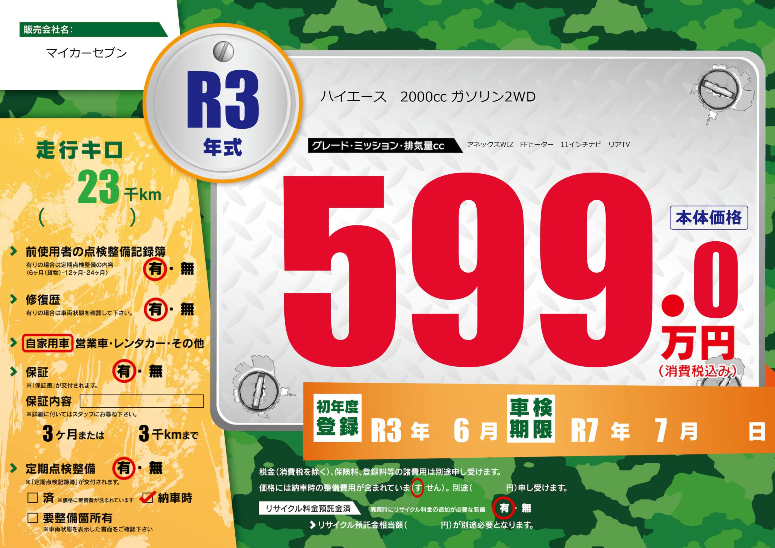 | 車名 | ハイエース 2000cc ガソリン2WD | グレード ミッション 排気量 |