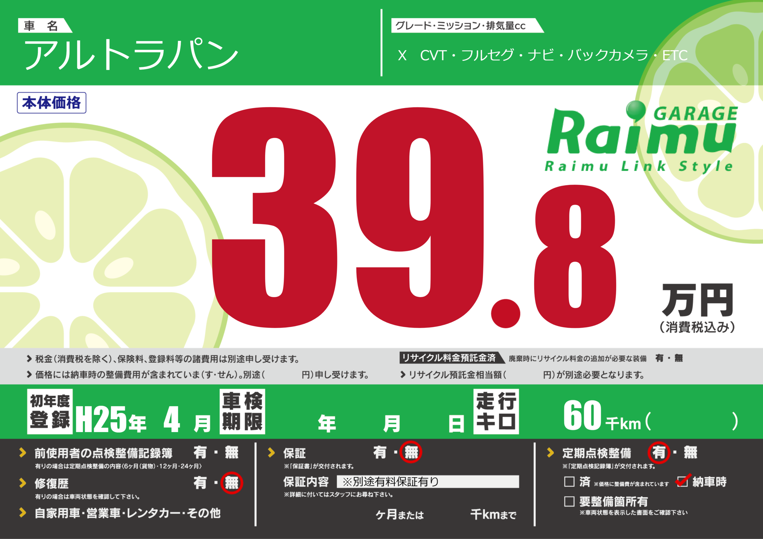 | 走行キロ | 6万km | 初年度登録 | H25年4月 |