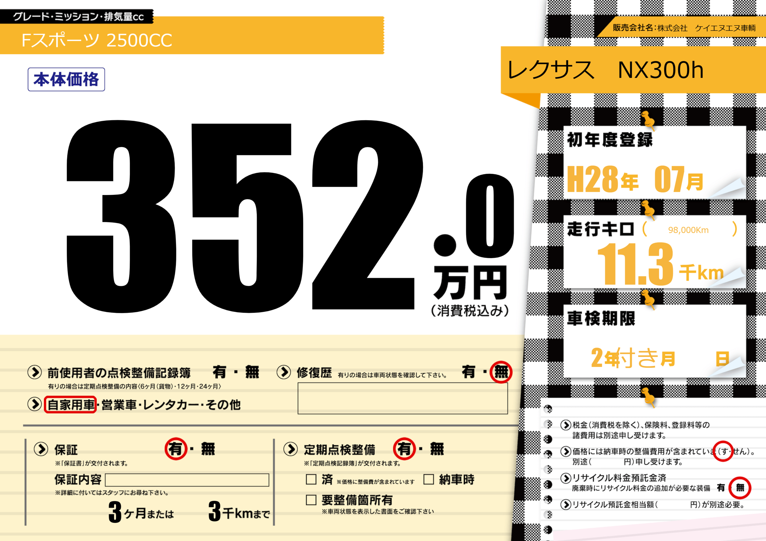 | 車名 | レクサス NX300h | グレード ミッション 排気量 |