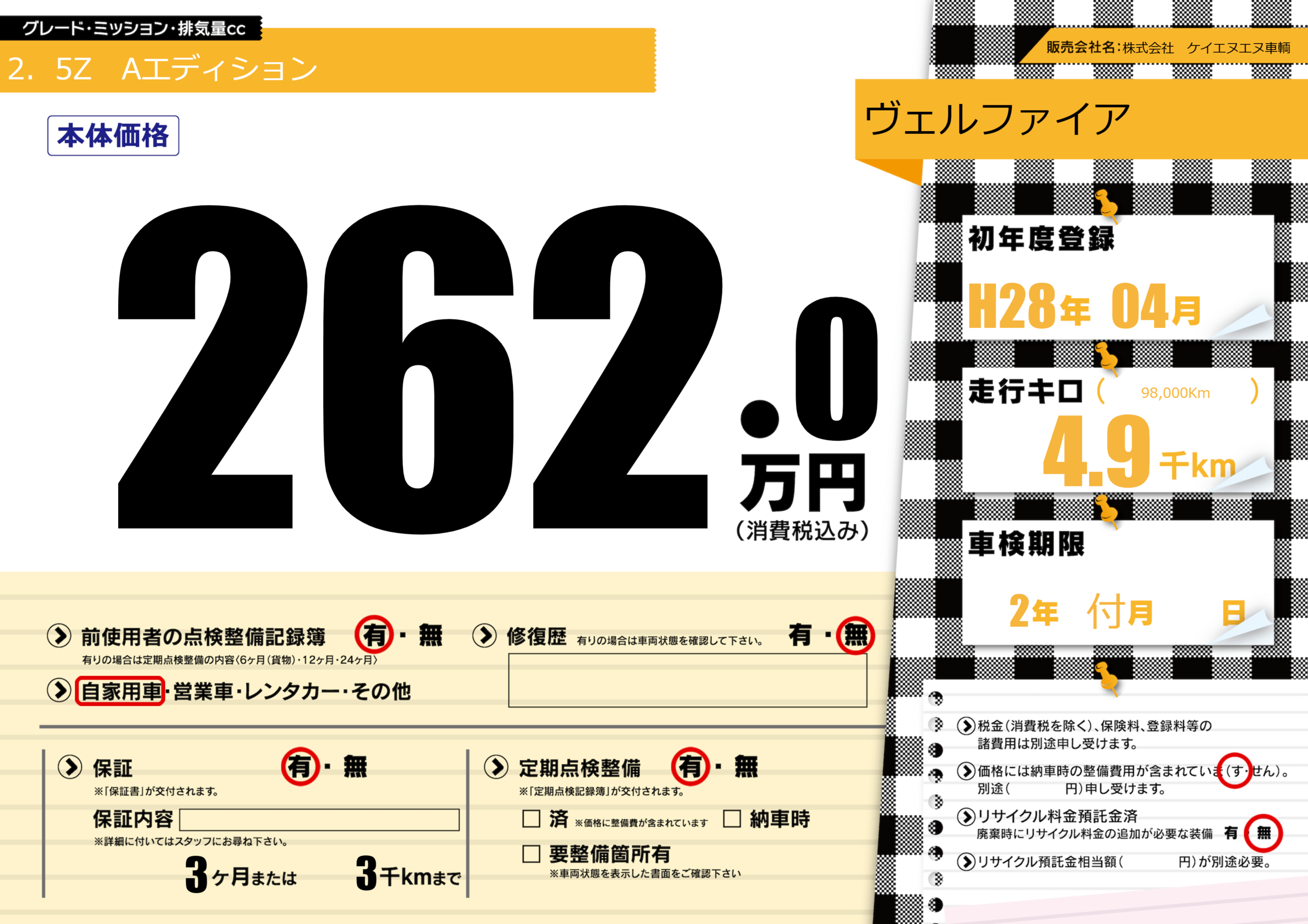 | 車名 | ヴェルファイア | グレード ミッション 排気量 |
