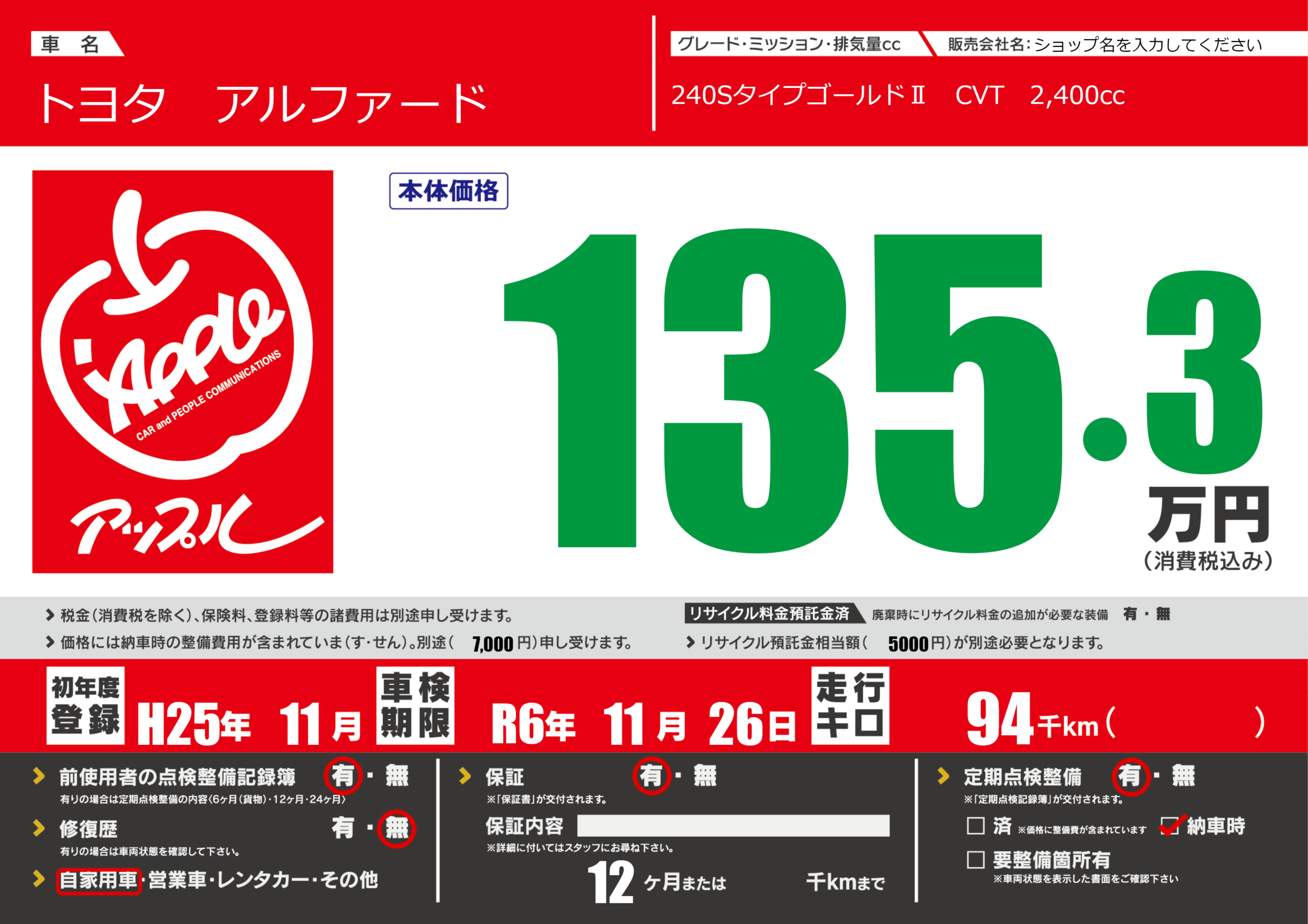 | 車名 | トヨタ アルファード | グレード ミッション 排気量 |