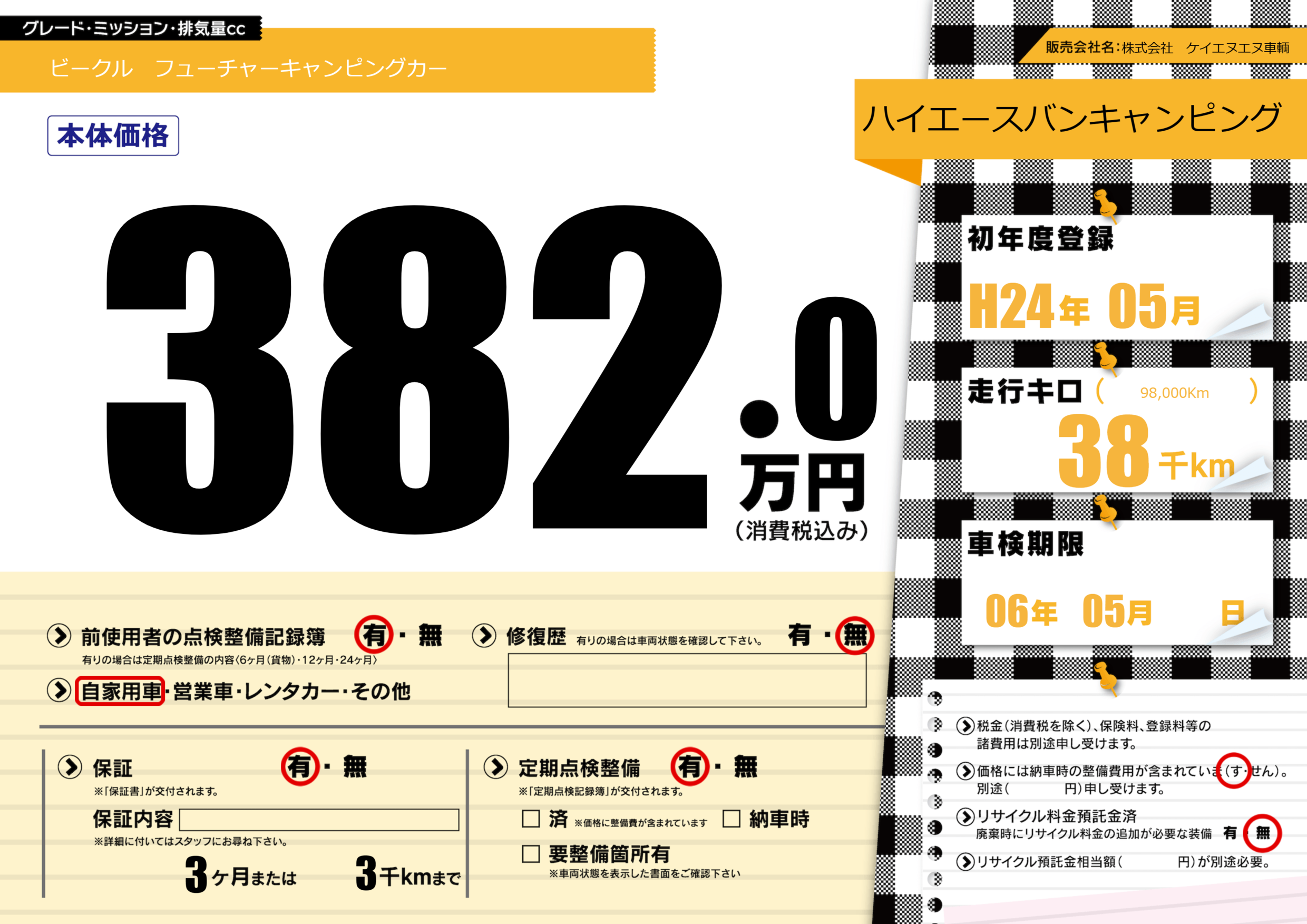 | 車名 | ハイエースバンキャンピング | グレード ミッション 排気量 |
