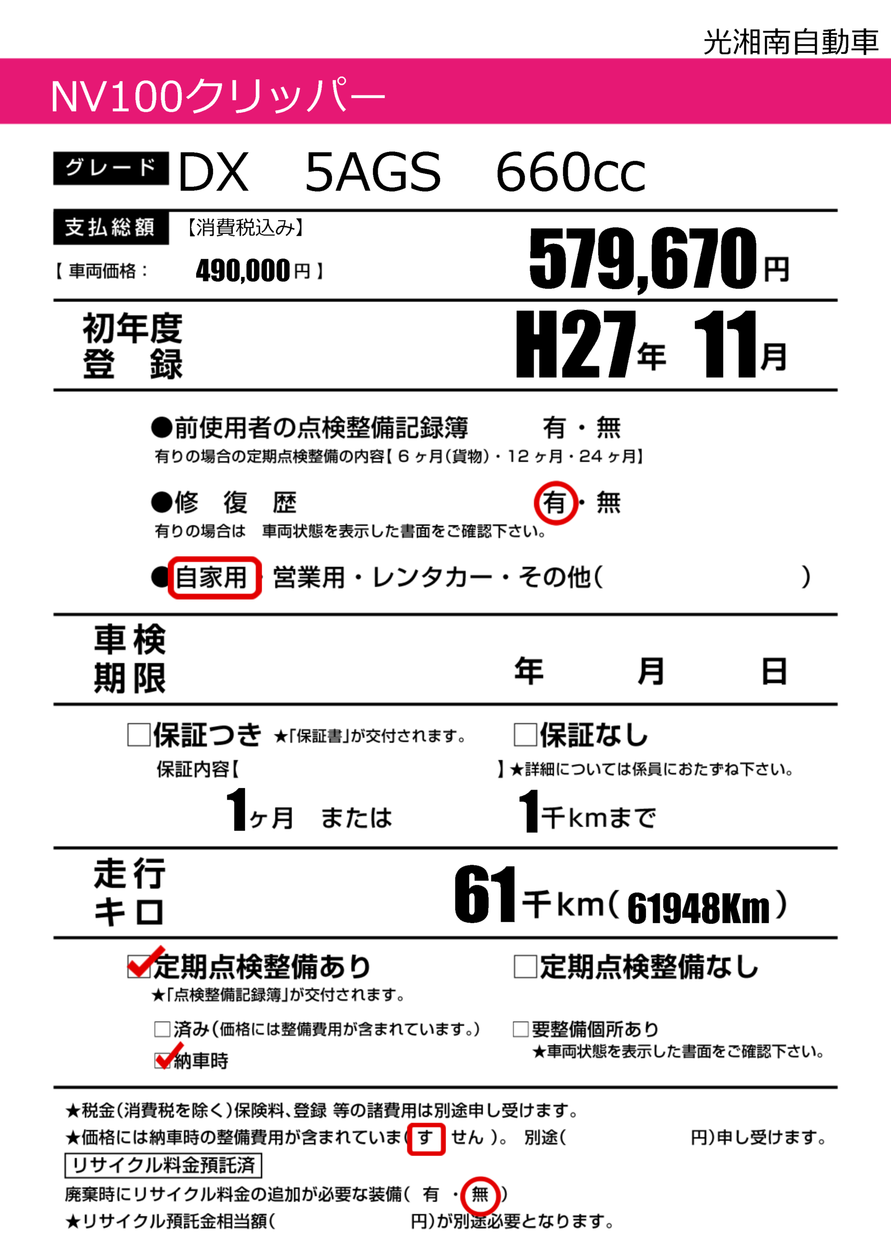 | 定期点検整備 | 定期点検整備あり 納車時あり | ||