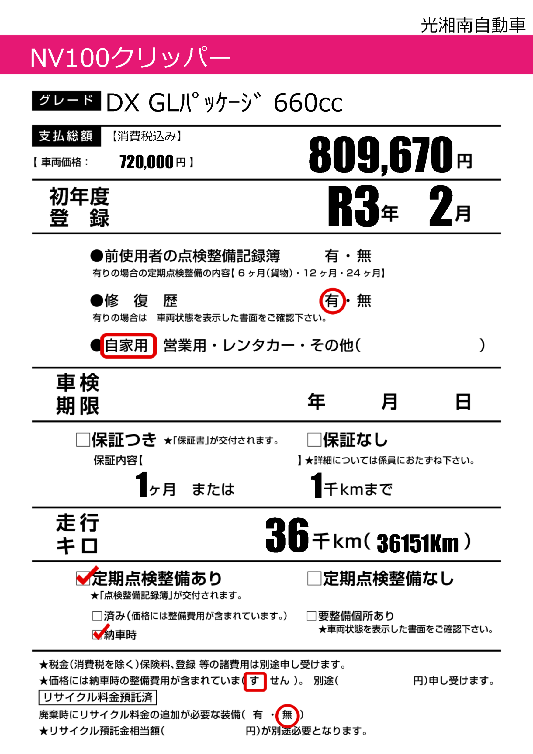 | 定期点検整備 | 定期点検整備あり 納車時あり | ||