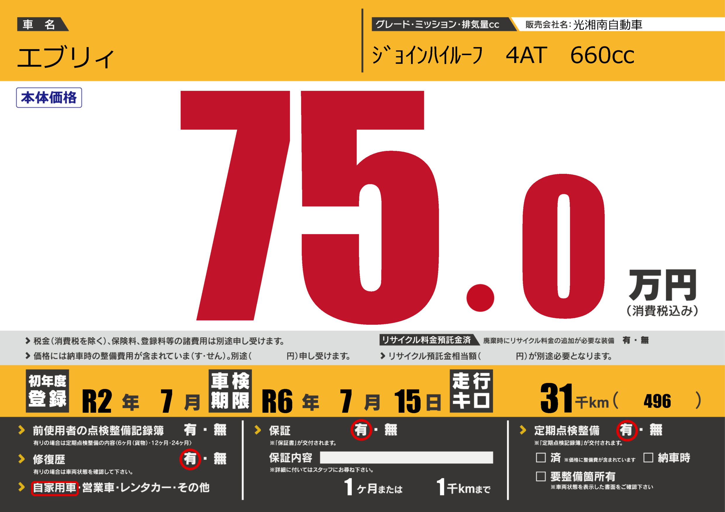 | 車名 | エブリィ | グレード ミッション 排気量 |