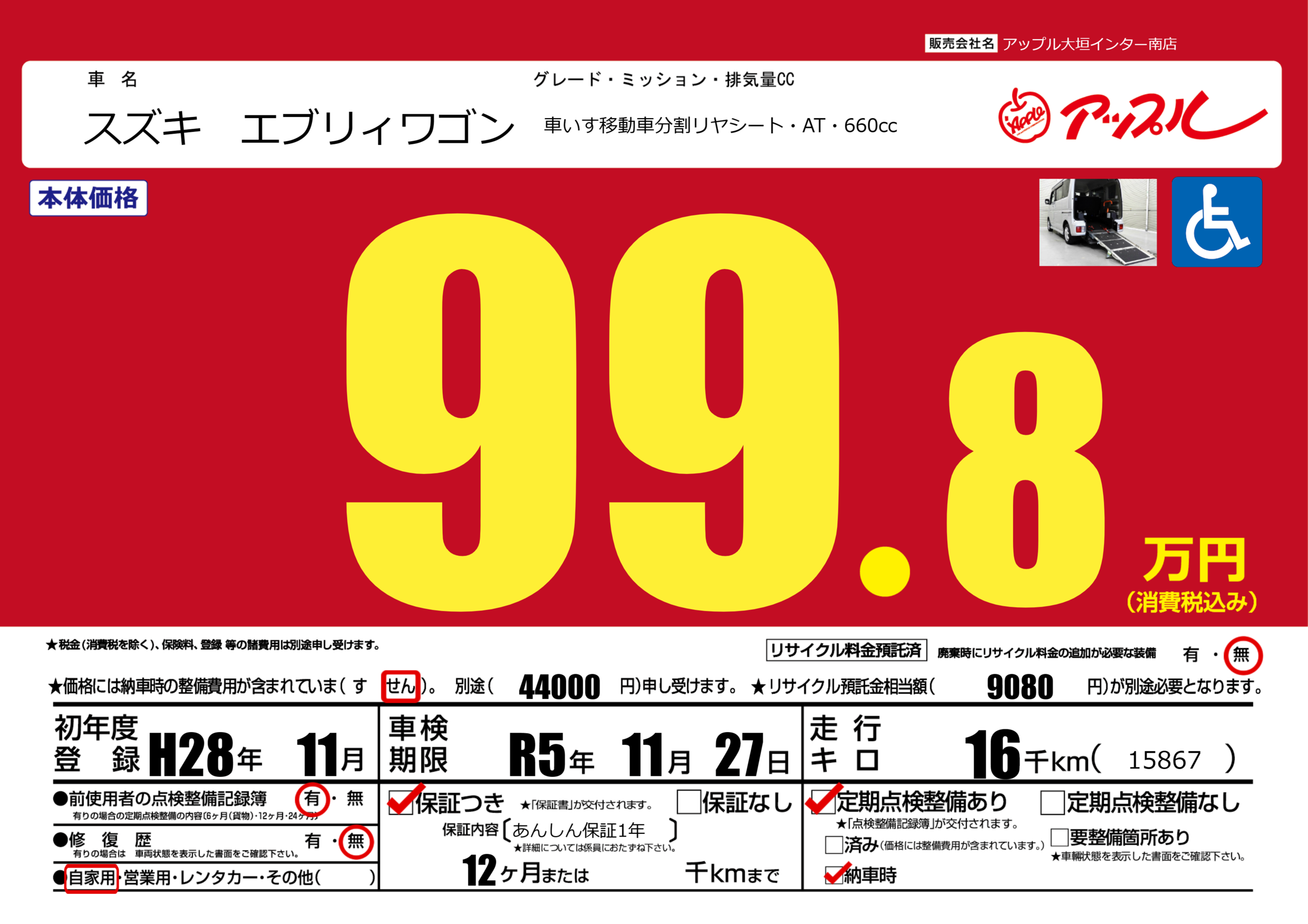 | 車名 | スズキ エブリィワゴン | グレード ミッション 排気量 |