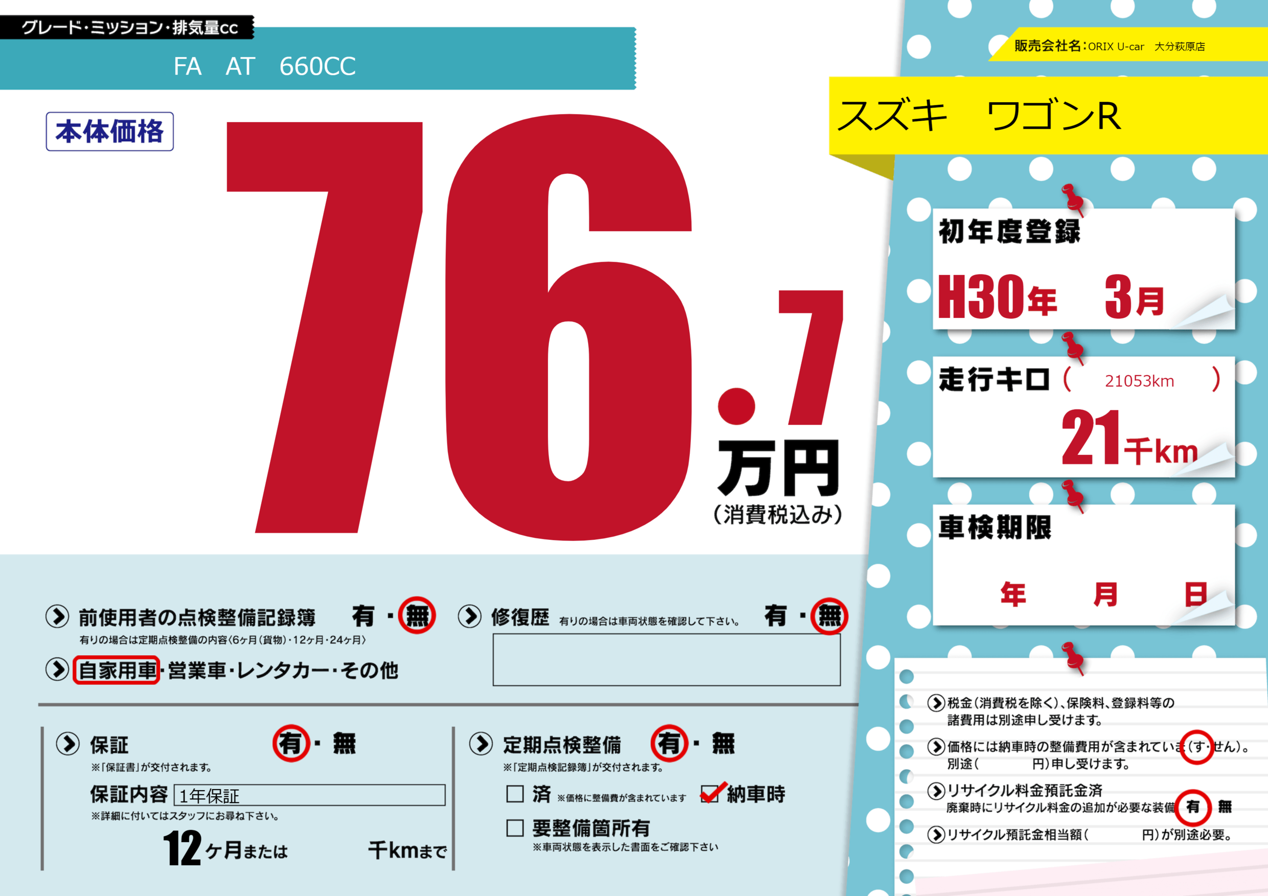 保証付き 保証内容(1年保証) 12ヶ月または()千kmまで |