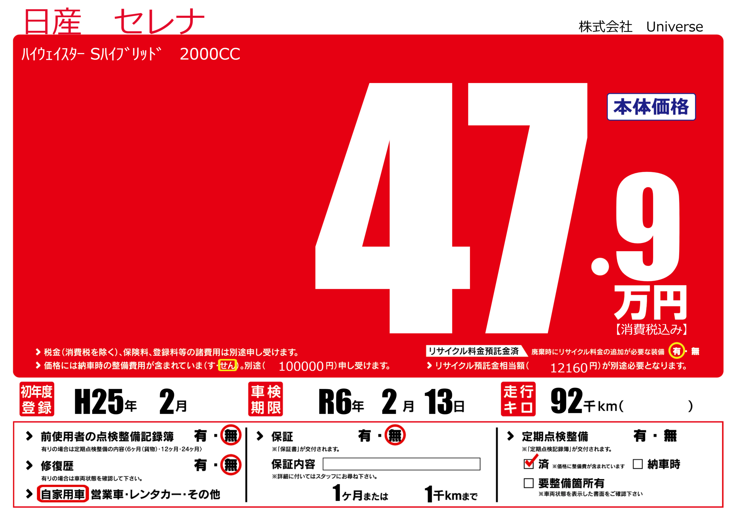 | 走行キロ | 9.2万km | 初年度登録 | H25年2月 |