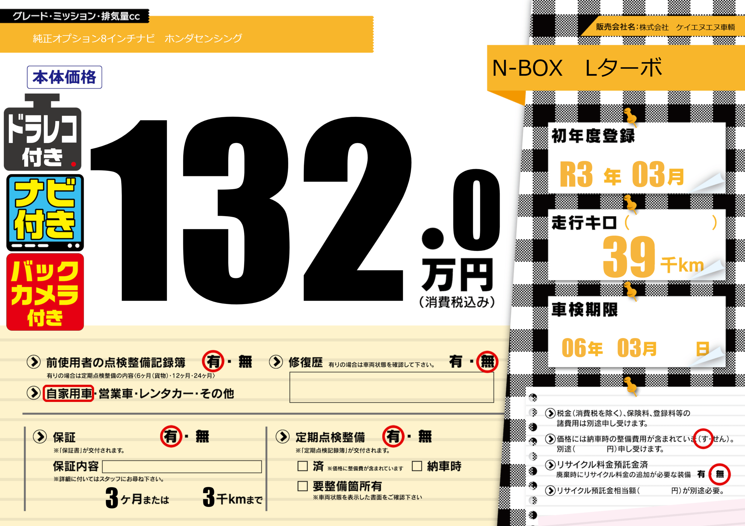 | 車名 | N-BOX Lターボ | グレード ミッション 排気量 |
