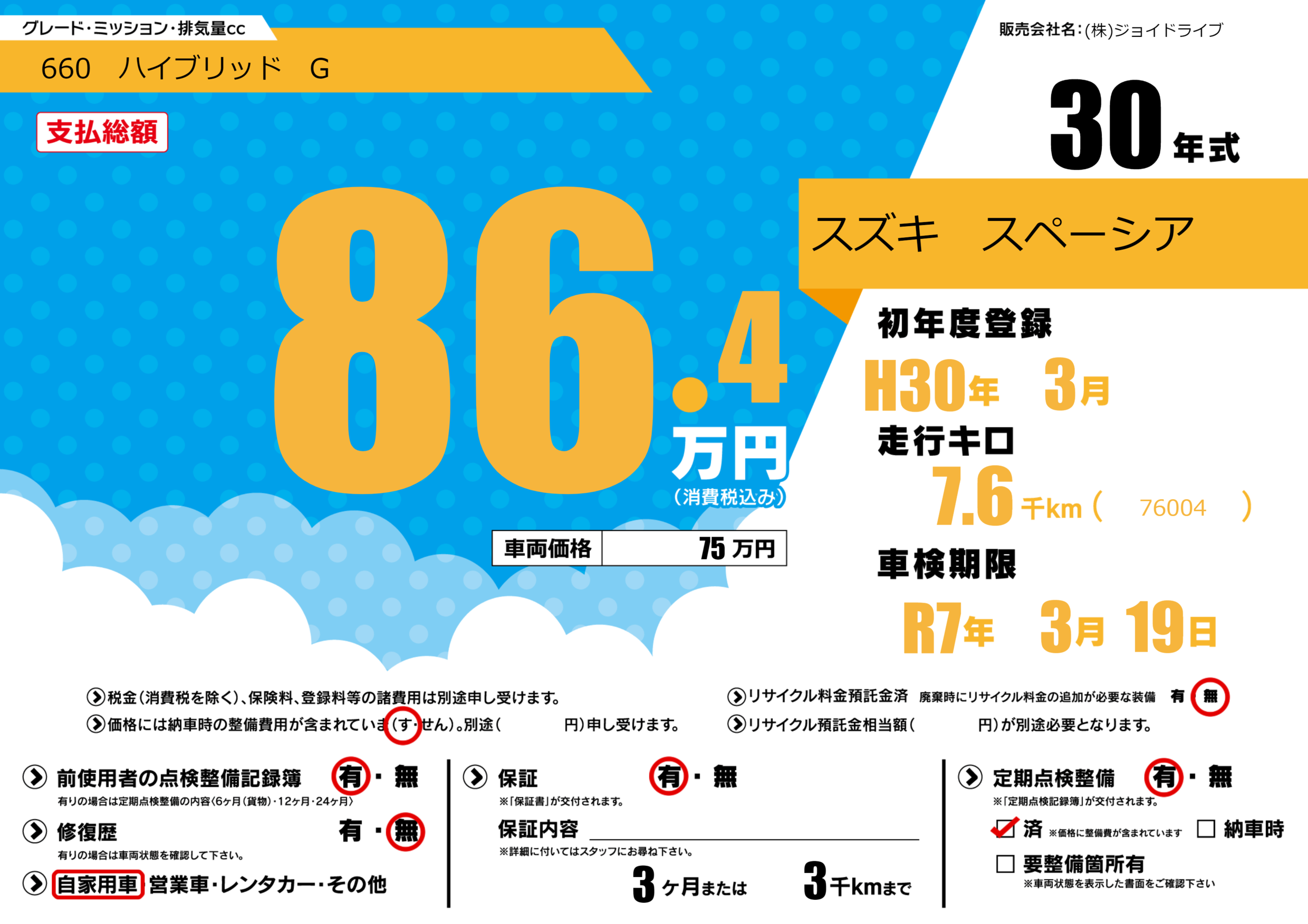| 定期点検整備 | 定期点検整備あり 定期点検整備済み | ||