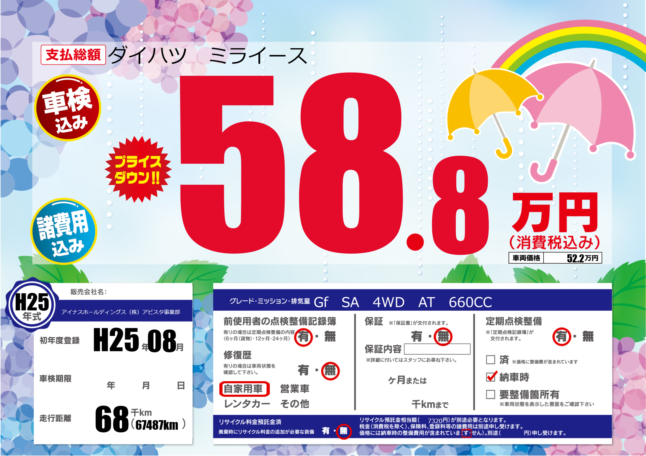 | 定期点検整備 | 定期点検整備あり 納車時あり | ||