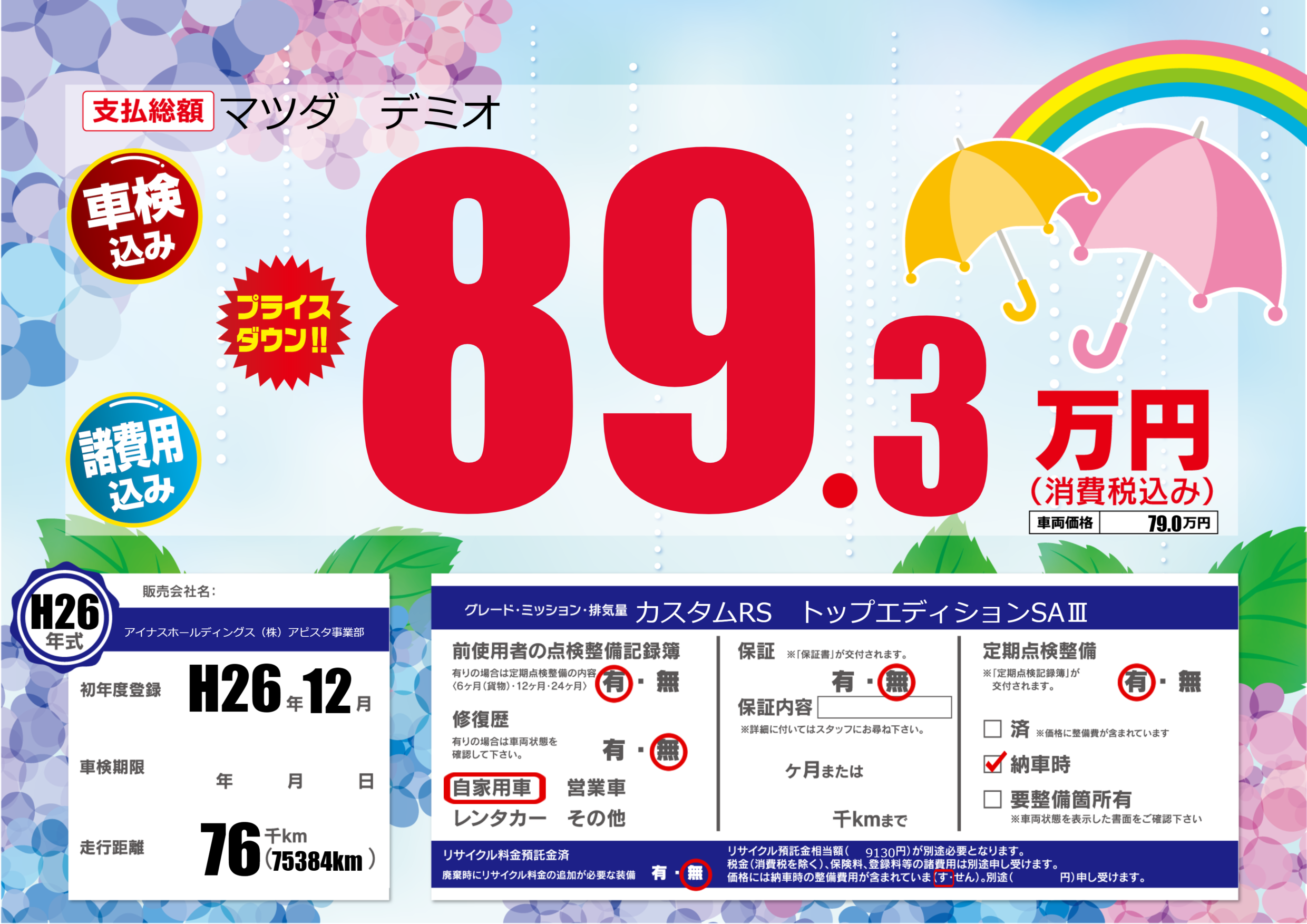 | 車名 | マツダ デミオ | グレード ミッション 排気量 |