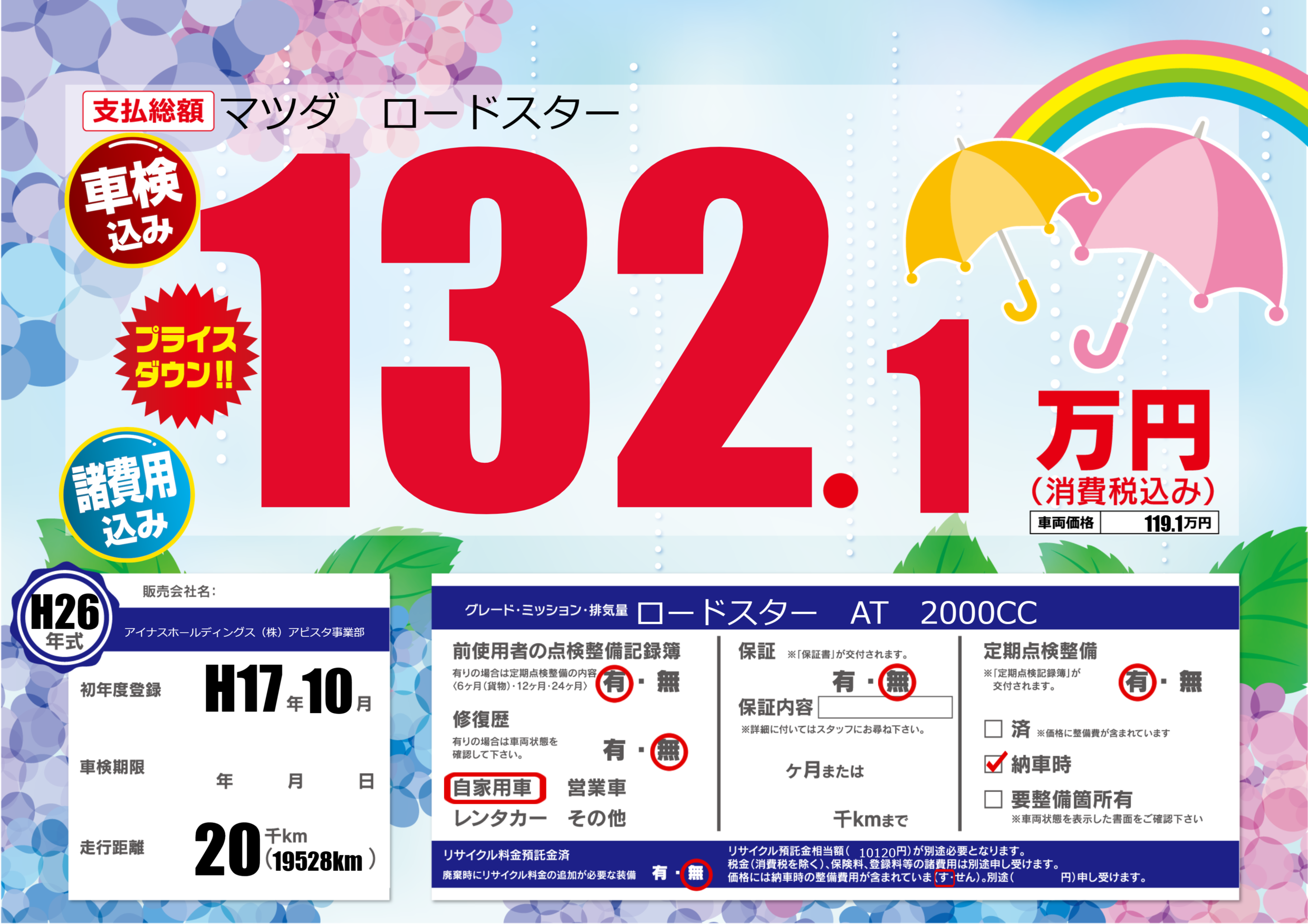 | 走行キロ | 2万km | 初年度登録 | H17年10月 |
