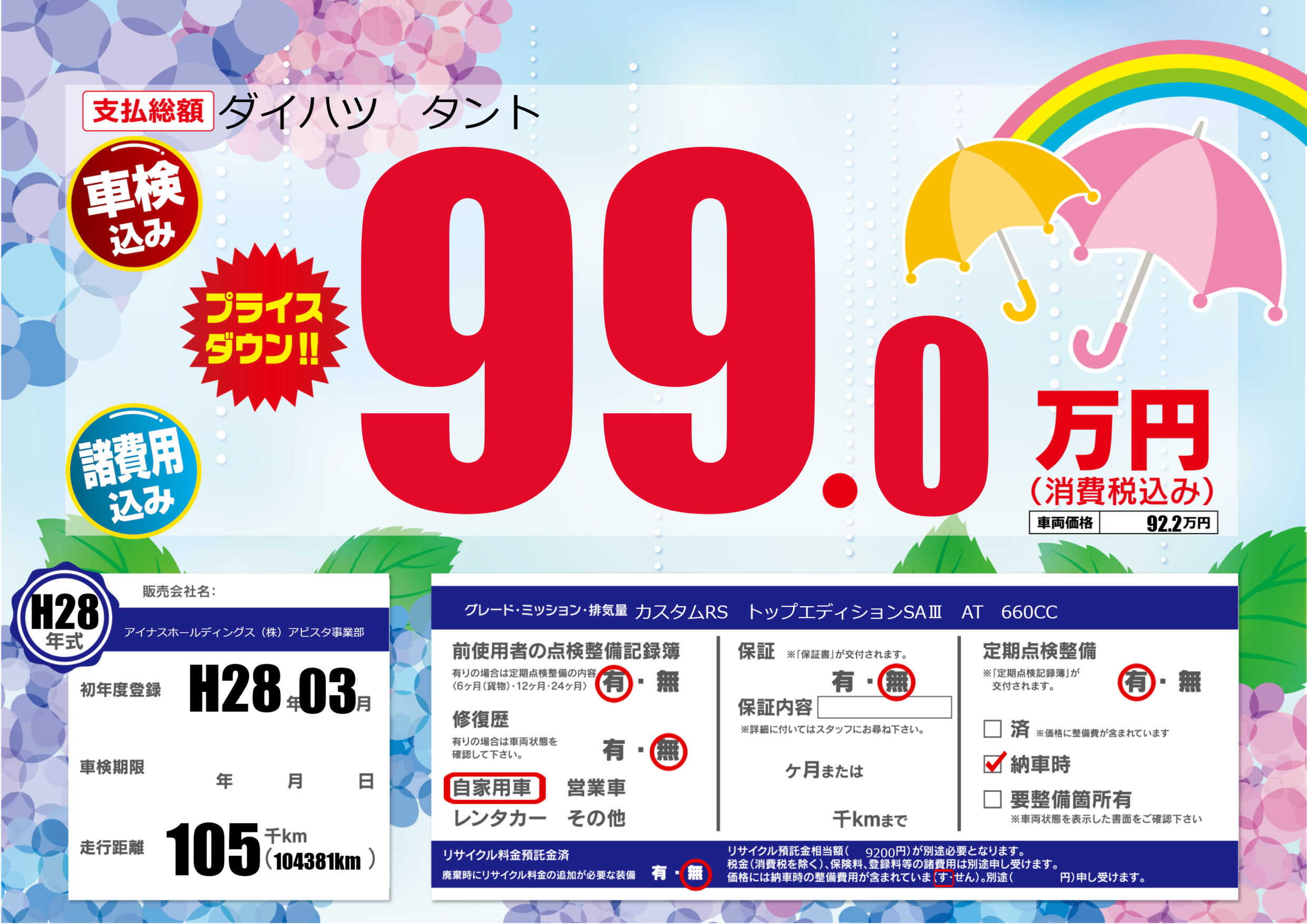 | 車名 | ダイハツ タント | グレード ミッション 排気量 |