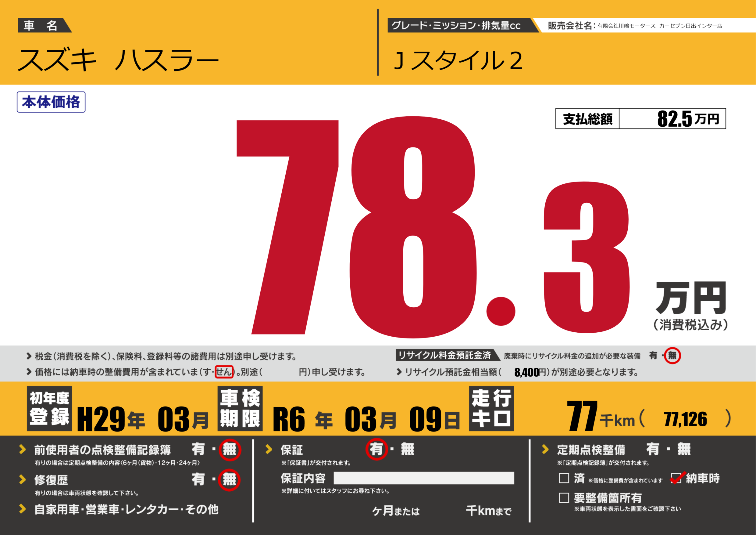 | 車名 | スズキ ハスラー | グレード ミッション 排気量 |