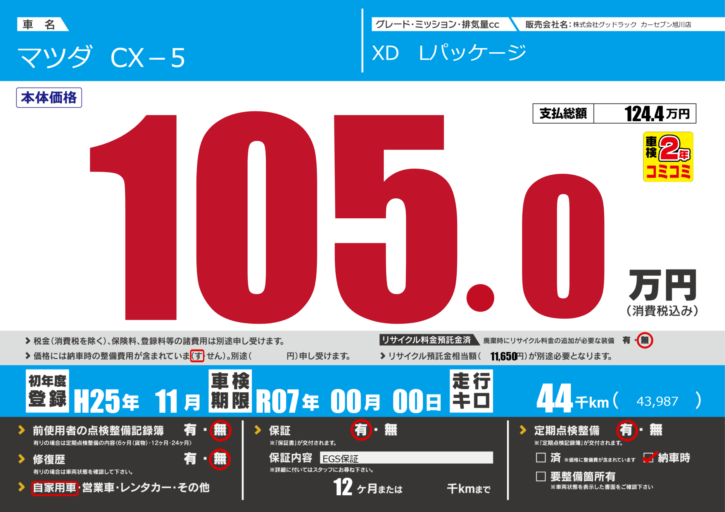 | 車検制限 | R07年 00月 00日 | ||
