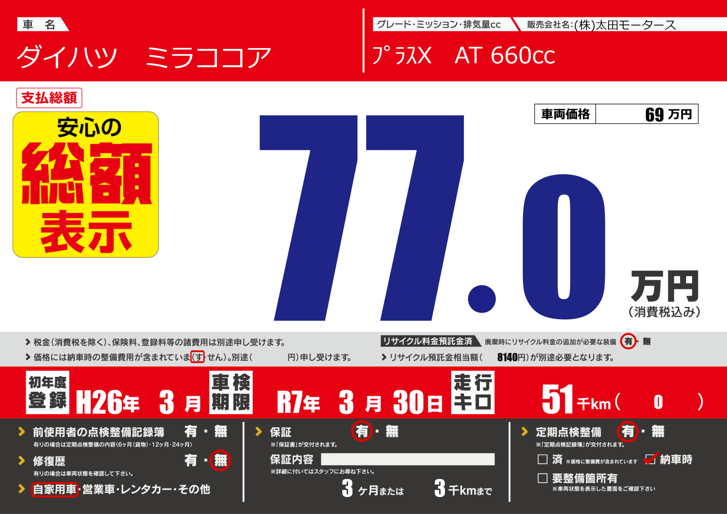 | 走行キロ | 5.1万km | 初年度登録 | H26年3月 |