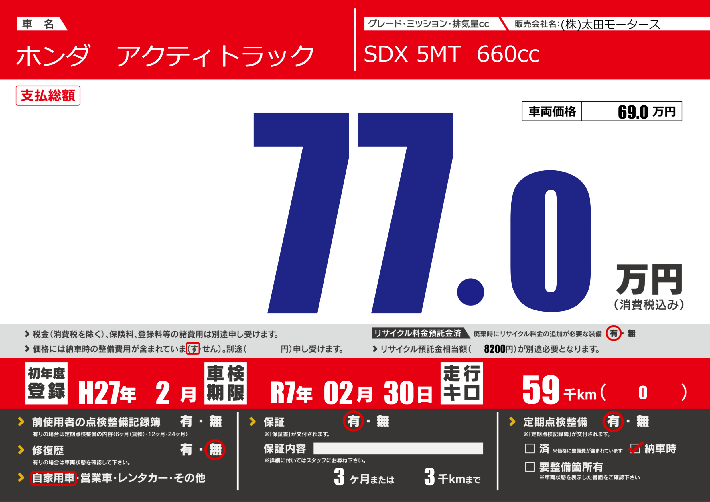| 車名 | ホンダ アクティトラック | グレード ミッション 排気量 |