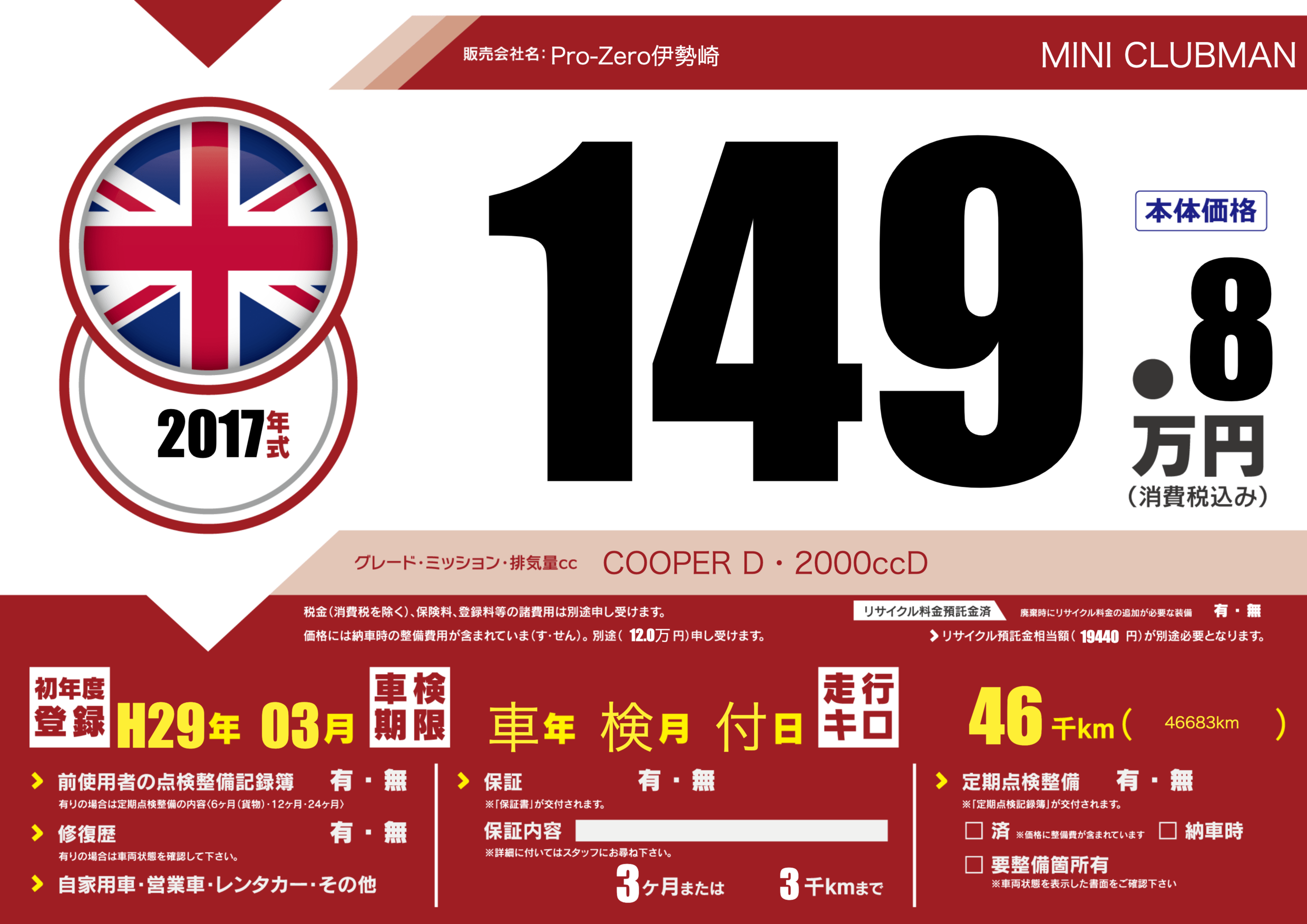 | 車名 | MINI CLUBMAN | グレード ミッション 排気量 |