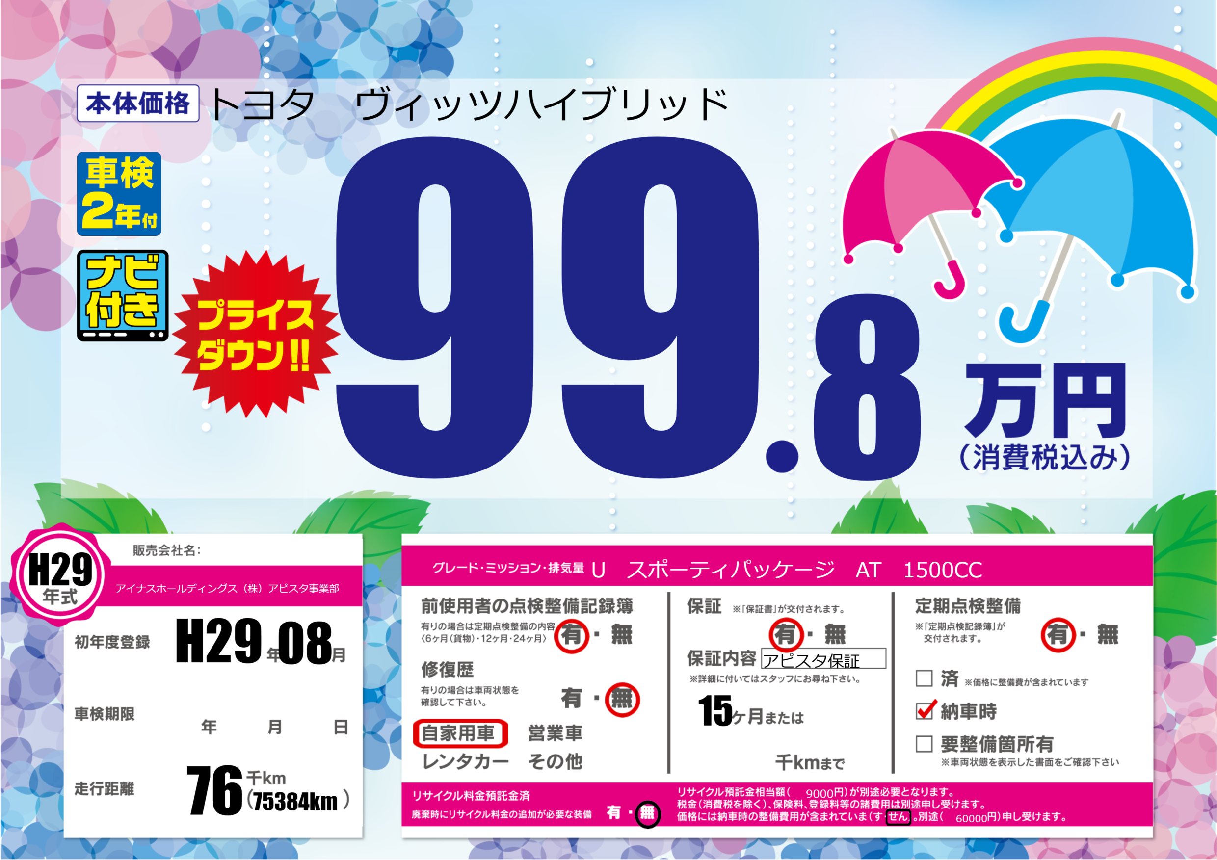 | 車名 | トヨタ ヴィッツハイブリッド | グレード ミッション 排気量 |