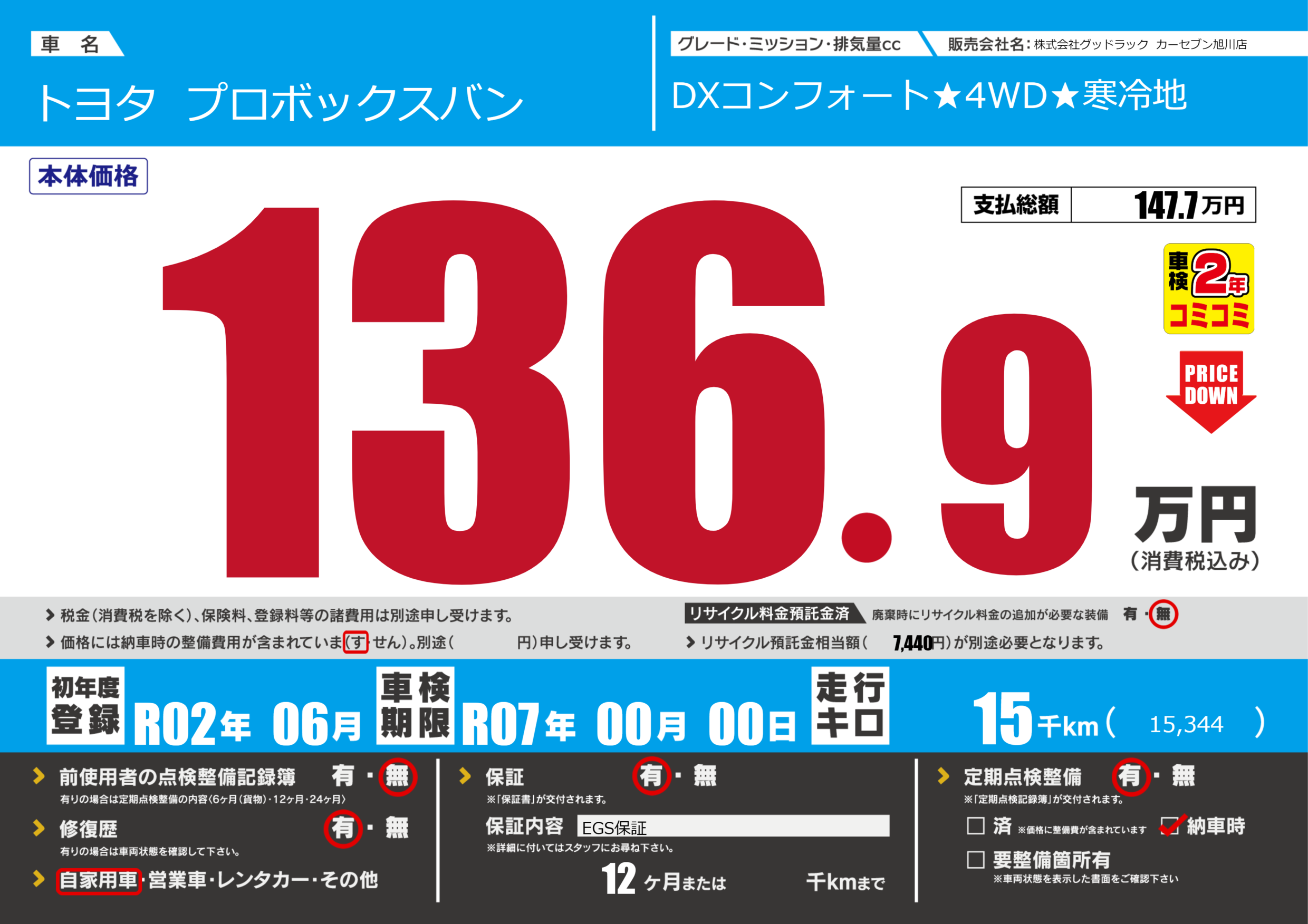 | 車名 | トヨタ プロボックスバン | グレード ミッション 排気量 |