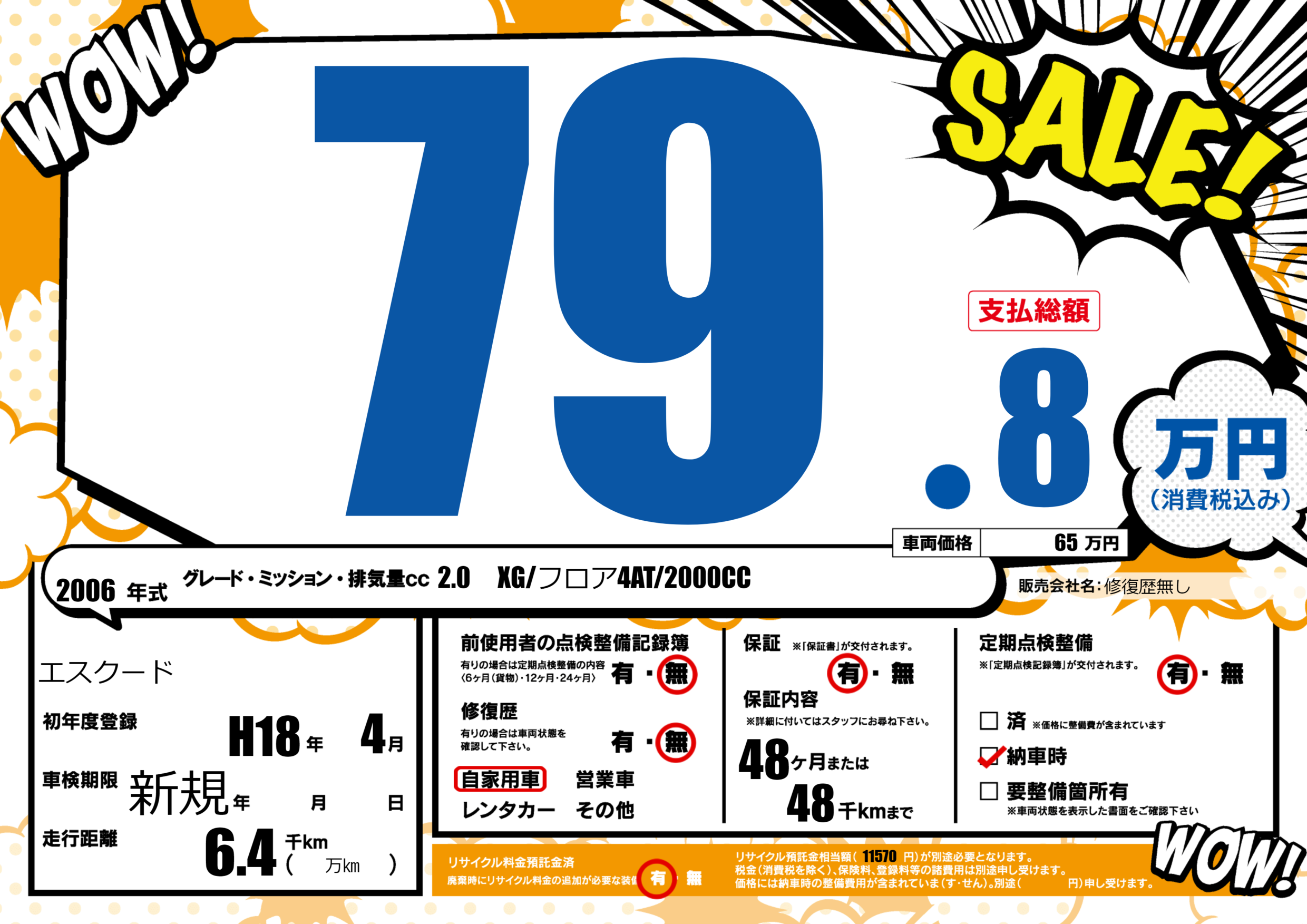 | 走行キロ | 0.6万km | 初年度登録 | H18年4月 |