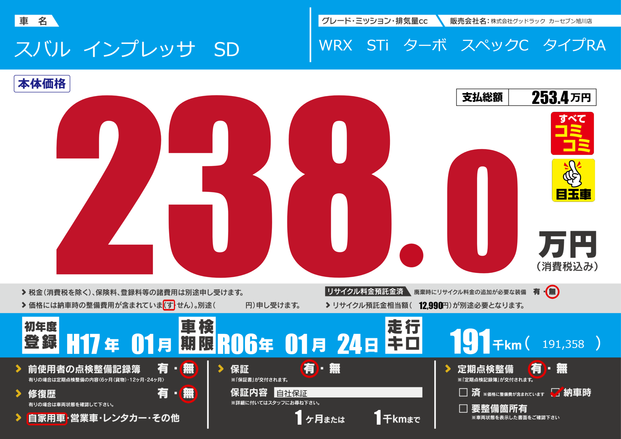 | 車名 | スバル インプレッサ SD | グレード ミッション 排気量 |