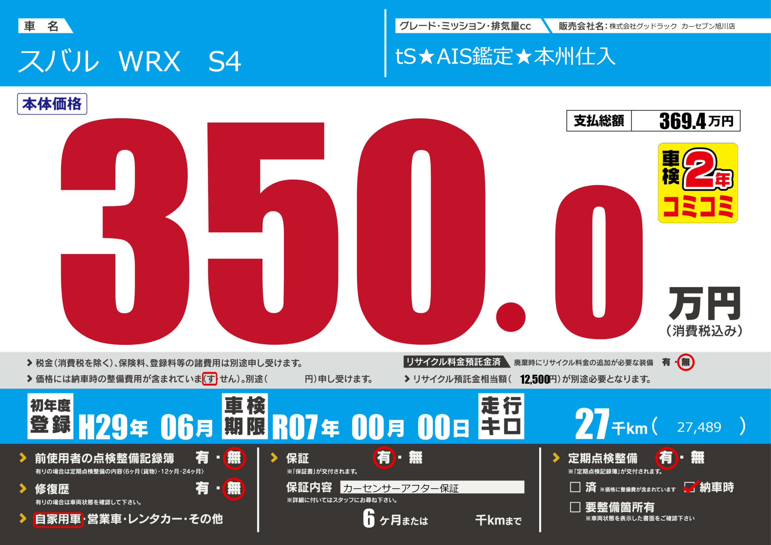 | 車名 | スバル WRX S4 | グレード ミッション 排気量 |