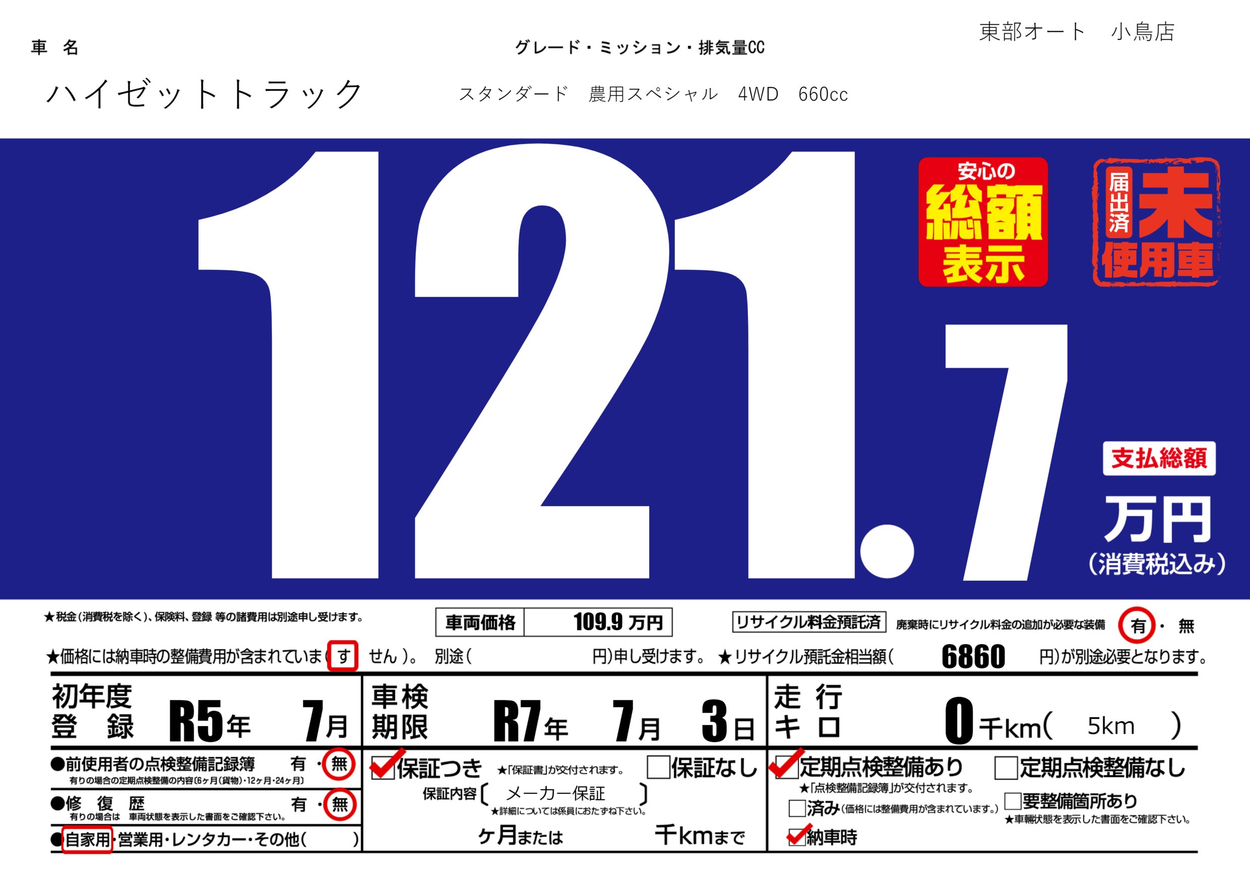 | 車名 | ハイゼットトラック | グレード ミッション 排気量 |