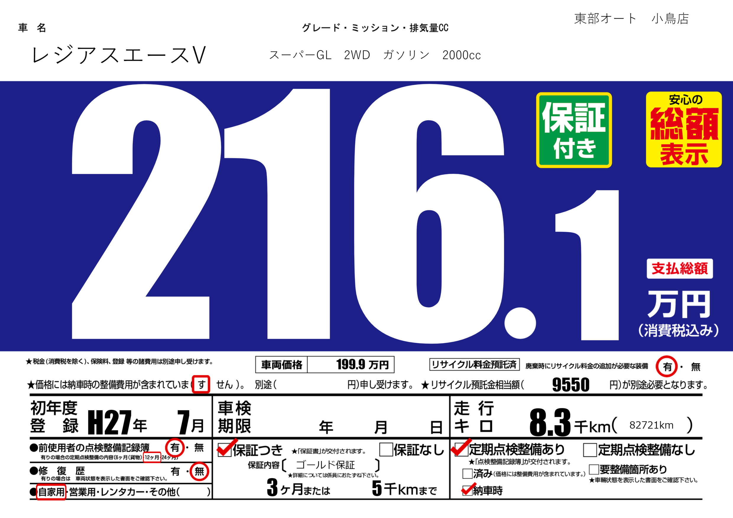 | 車名 | レジアスエースV | グレード ミッション 排気量 |