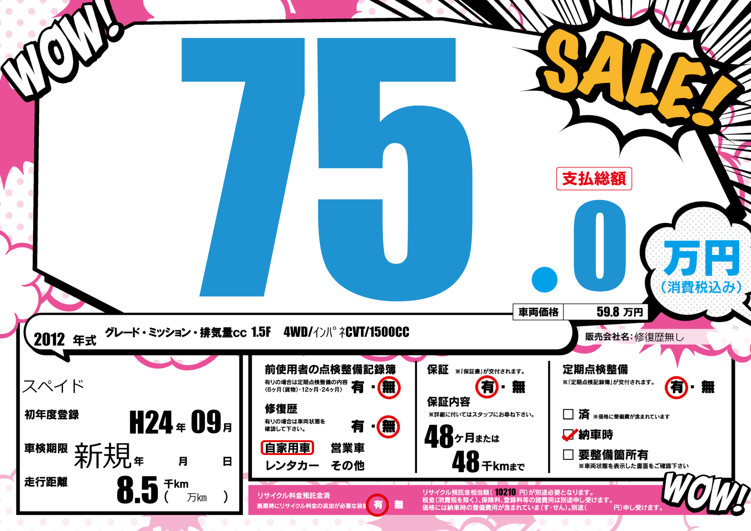 | 走行キロ | 0.8万km | 初年度登録 | H24年09月 |
